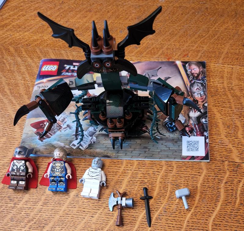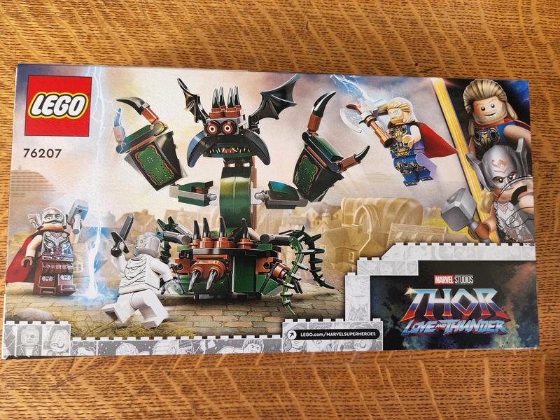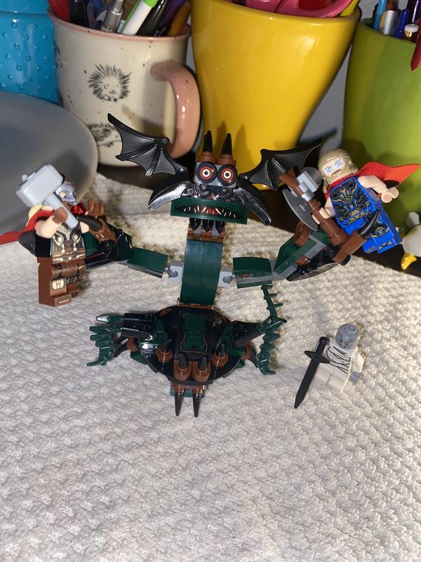 While many Lego sets are intended for play instead of display, this set falls short because three more pieces would have made a great deal of difference. As you can see from the video display, the back of the creature exposes tubes of Lego bricks. It would have been good to have a couple of parts to cover that exposure. Further, for much of the scene depicted in this play set, Jane as the Mighty Thor is not wearing the helmet; an additional piece to offer her in just her hair would have been welcome. Otherwise, the set offers a fun depiction of the film's scene. Three more pieces, however, would make a big difference.
