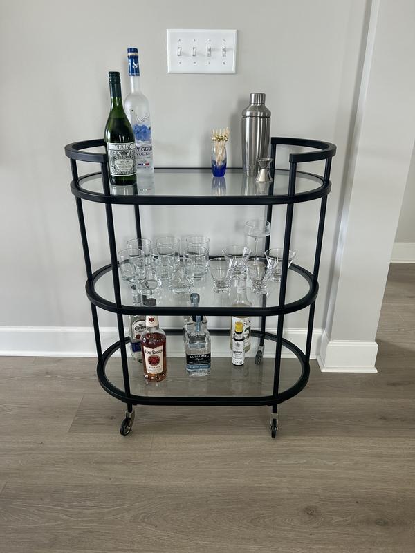 Combine functionality and on-trend design with this eye-catching modern bar cart. Its curved glass shelves are offset by your choice of neutral metallic finishes. Handles and wheels provide easy mobility from room to room.