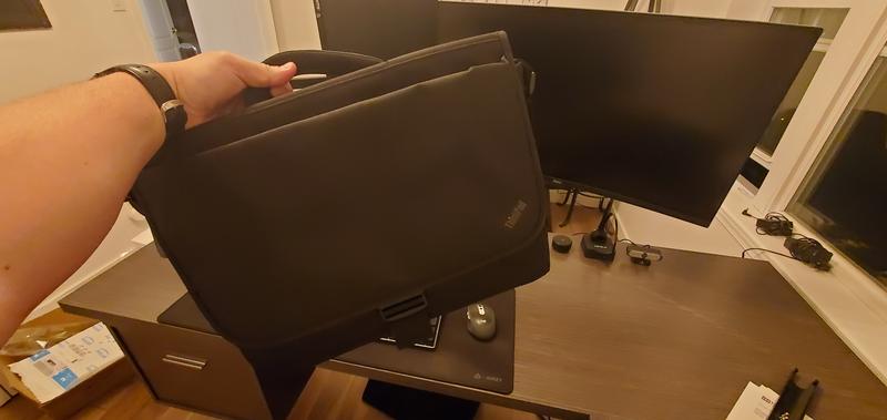 Great bag that my laptop and necessary accessories great. One of the cool features that the bag has is webbing on the side so if you need to clip larger items or keys you can.