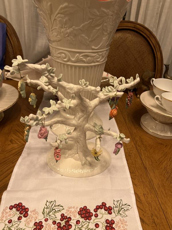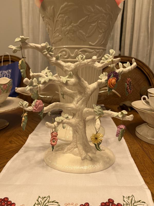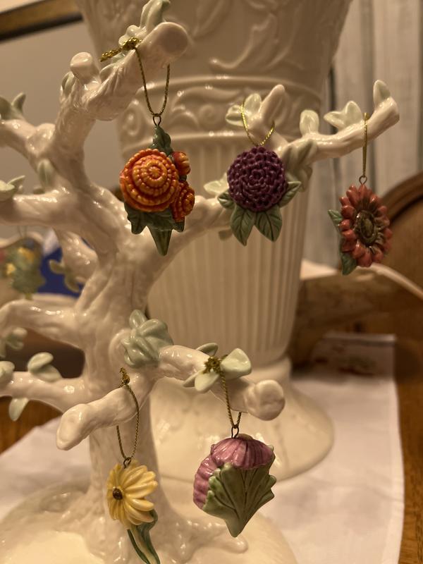 Absolutely fun tree with fall flower ornaments. Its nearly 12" height and width make it noticeable while its airy design ensures it is not overpowering. It is difficult to find pretty well-made items that enhance a decor today. This creamy colored tree with gentle green leaves is neutral and blends well with the browns and coppers of the room's decor. It will be on display most of the year as Lenox's thoughtful designers created additional ornament sets.