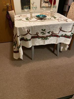 This tablecloth is perfect for the Christmas look I wanted. It is festive and beautiful. It has the traditional red & green of Christmas, which coordinates with my tabletop decor.