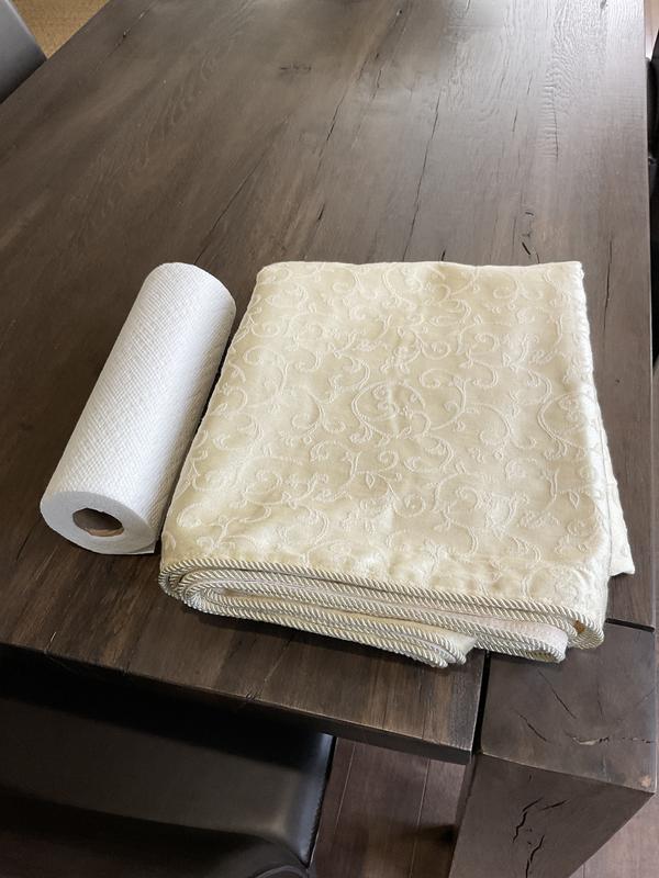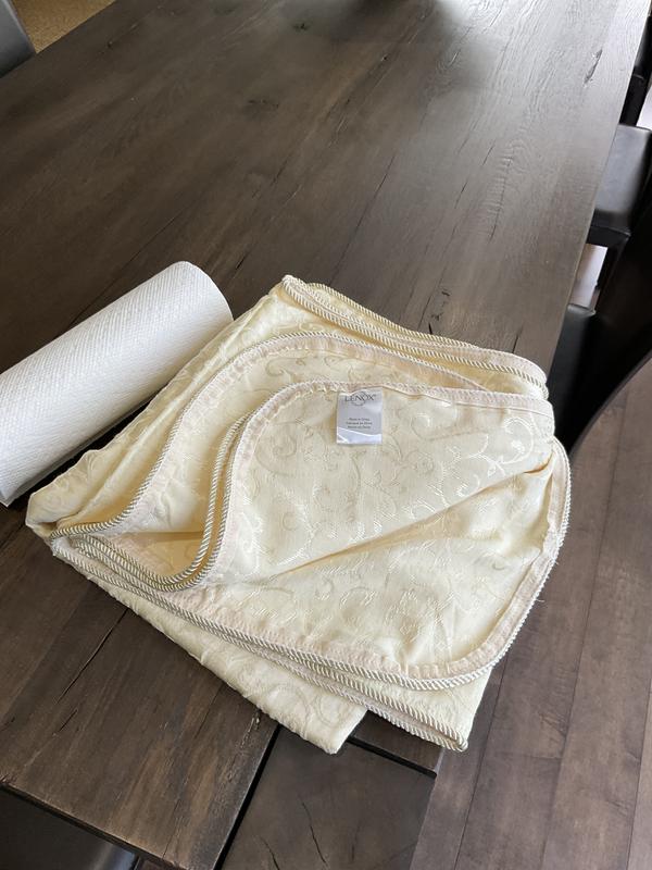 This tablecloth is breathtaking. I washed it in eco-cold water on the gentle cycle & then placed in my dryer on low for 20 mins. & it came out perfect & didn't need to be ironed (anything cotton I always iron). I don't understand the poor reviews this has received. It is definitely worth buying. Lenox china (which I bought 23+ yrs. ago) matches this tablecloth. So soft & elegant. The cording is a nice added touch.