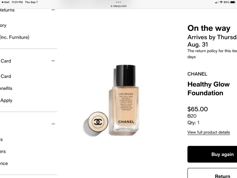 Very pleased with the Chanel foundation. It’s an excellent product and far superior to any of the foundations I’ve used in the past. It gives a subtle shimmer and seems to moisturize my again skin.