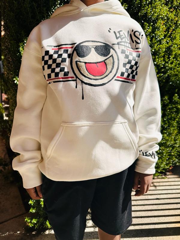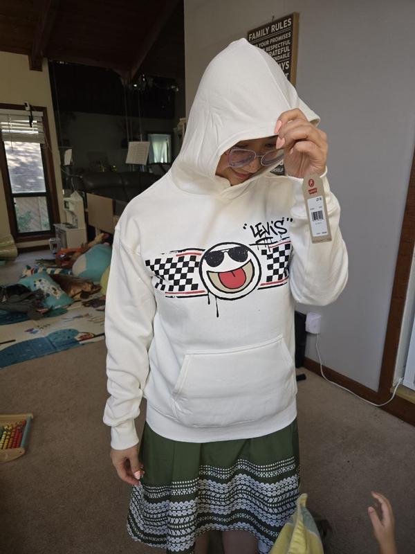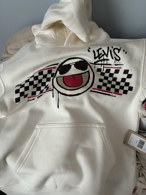 Levi’s Kids XXL Jack Hoodie – Playful Design Meets Premium Comfort The Levi’s Kids XXL Jack Hoodie is a delightful blend of comfort, quality, and modern streetwear appeal. Although it’s designed for kids, the XXL size offers a surprisingly good fit for petite adults as well, making it a versatile option for anyone who enjoys a relaxed, youthful style. The fabric feels soft yet durable, offering a nice balance between warmth and breathability. The fleece interior provides excellent comfort for cooler days without feeling overly thick or restrictive. The stitching and overall construction are consistent with Levi’s reputation for craftsmanship—clean seams, no loose threads, and a high-quality finish throughout. Visually, the hoodie stands out with its bold, graphic design featuring a retro smiley face, checkerboard stripe, and playful “Levi’s” graffiti-style logo. The artwork adds personality while maintaining a stylish balance that appeals to both kids and adults who appreciate trendy, expressive fashion. The hood is well-sized, providing good coverage, and the front pocket is spacious enough for small essentials or simply keeping your hands warm. The off-white color pairs easily with jeans, leggings, or casual skirts, making it a versatile piece for everyday wear. Overall, the Levi’s Kids XXL Jack Hoodie delivers excellent value for its price—comfortable, well-made, and eye-catching. Highly recommended for anyone seeking a fun yet functional hoodie that showcases Levi’s youthful creativity and reliable quality