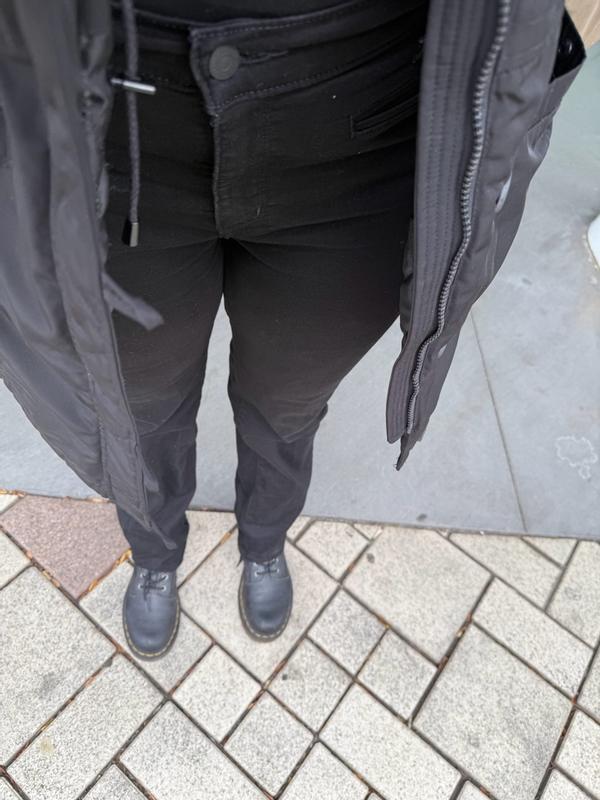 The 314 Shaping Tailored Jeans in Soft Black are a great fit. I followed the size chart, and they fit me well. The bottom of the jeans hits below my ankle, giving me enough room for a platformed boot without the jeans touching the ground. The cotton/polyester blend fabric is stretchy and comfortable, allowing me to sit, squat, bend over, and move freely. My stomach, thighs, and ankles don’t feel squished, which is important to me. The only downside is that the material picks up fuzz, requiring a bit of a lint roll. I’ve machine washed and dried them, and the back pocket did stretch out a bit, but it doesn’t affect the overall appearance of the jeans. I love that they have belt loops, front and back pockets, and that the classic straight leg style looks great with everything. These are my measurements at time of purchase: Size: 34 x 32 (Size 14) Waist: 35-36 inches Hips: 43 inches Inseam: 32 inches Height: 5’8 Weight: 176 pounds