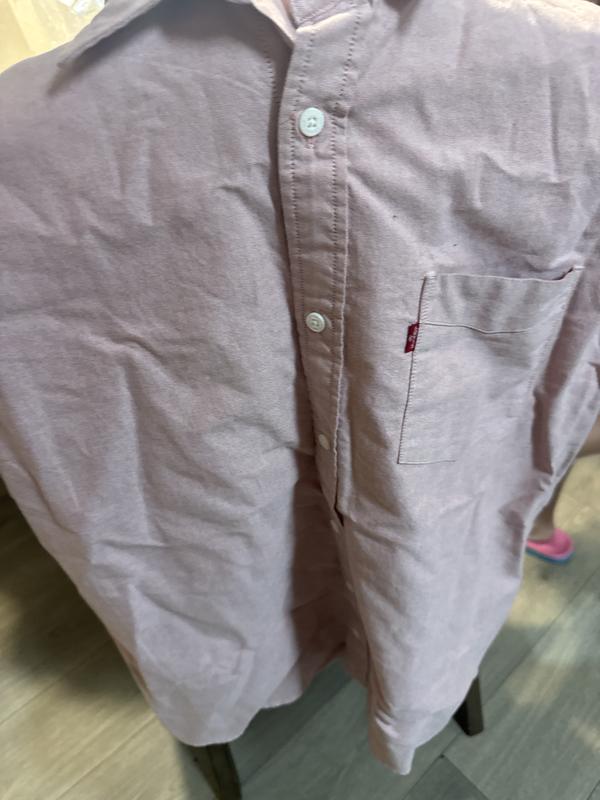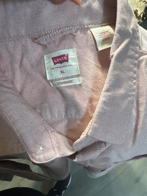This button-up shirt from Levi’s feels well-made and is true to size. It is a nice rose pink color made of a thick but breathable material. It has a single chest pocket with the classic red Levi’s tag stitched in next to it. This is definitely worth buying!