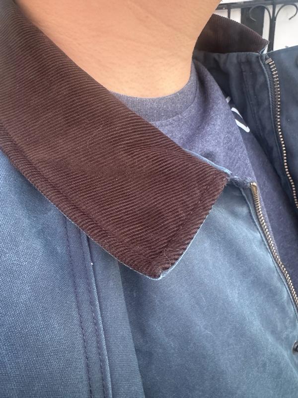 This medium-weight barn jacket is very comfortable and stylish. It fits slightly large and the sleeves are slightly long over a tee, but perfect over a sweater. The jacket is a bit stiff at first, but softens up with wear. The corduroy collar adds a nice contrast. I really like it!