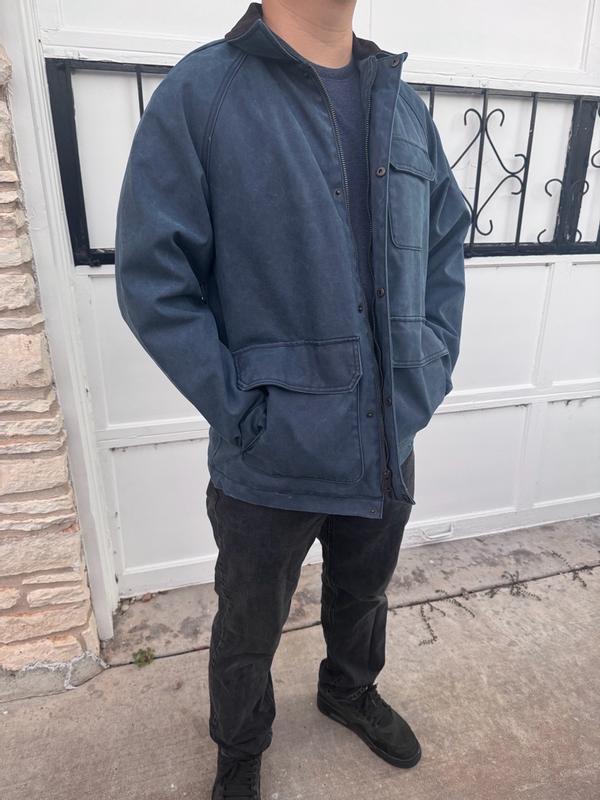 This is a nice midweight jacket with a quilted interior a curduroy collar and many pockets. I’m 5,8 190lbs and it fit me pretty well though the arms are a bit longer than I would like. I like the overlap cover for the zipper to help cut down on wind chill. It seems durable with a full cotton exterior and a full polyester liner. I feel pretty good with it in weather at 50F haven’t been able to use it in another lower so far