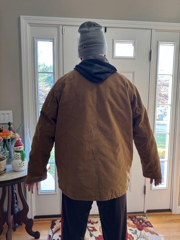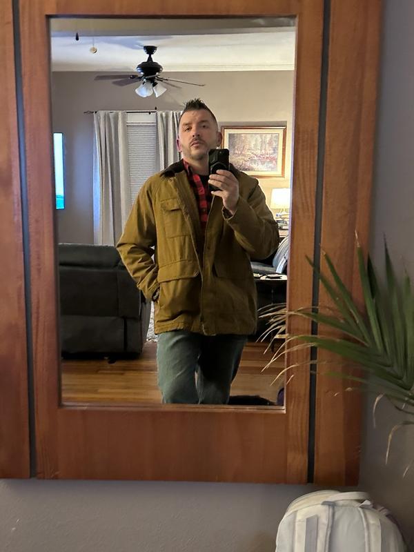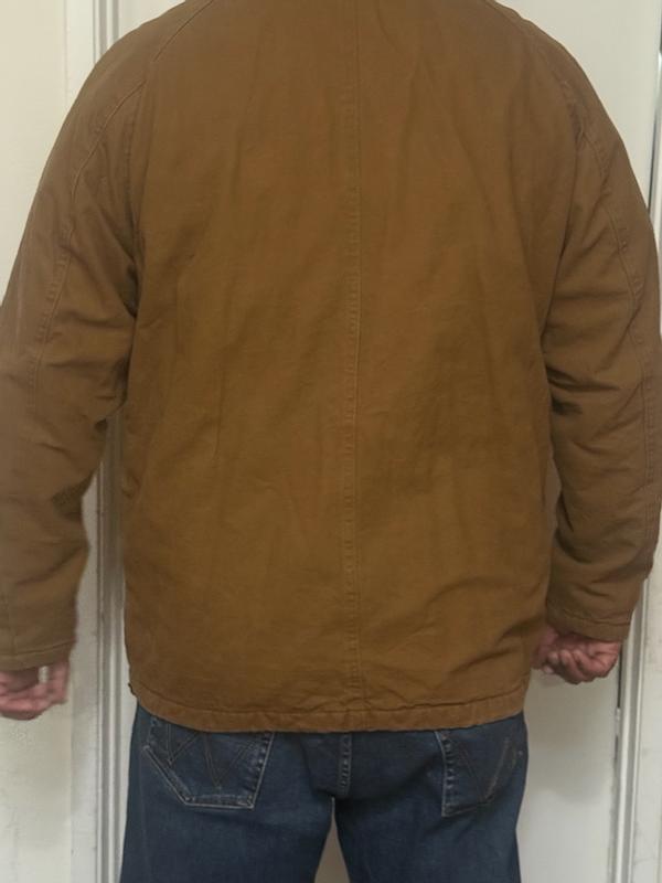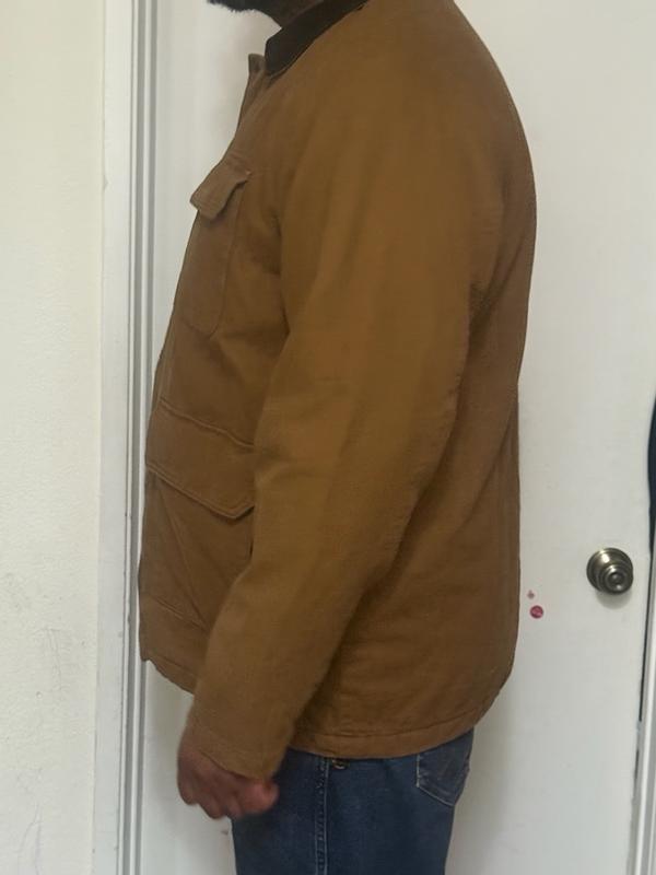 This jacket is really a great working man’s jacket for any outdoor activities. The material is tough yet comfortable and is made of a durable type of cloth. I find that it is true to size in that I have a XL size and typically wear Large. It is a little loose on me, but perfect with sweatshirts or other layers on underneath. I highly recommend this for anyone looking for a rugged working type of jacket.