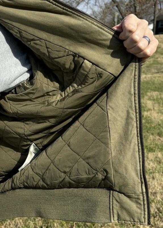 A light and VERY comfortable soft cotton jacket that honestly really classes up a pair of jeans. I've worn it with jeans and a T-shirt and it adds just the extra bit of insulation you need for early Fall. The pocket hems are sturdy and the zipper is heavy duty, while the quilted interior makes this more than just a utilitarian jacket.