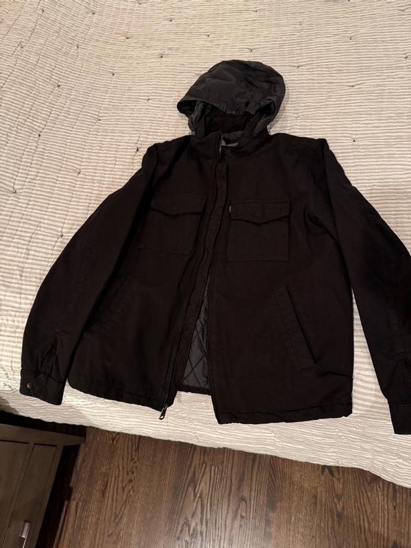 Great fitting and looking jacket. Feels and looks very high quality. Not stiff feeling like denim, but very soft. Comes with a hood that rolls up and zips inside the collar. Good is very thin and I don’t see much use for it.