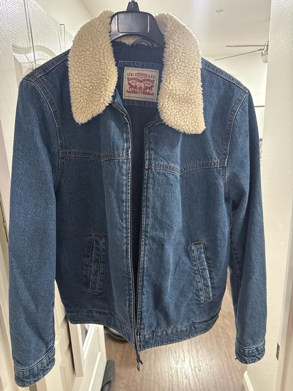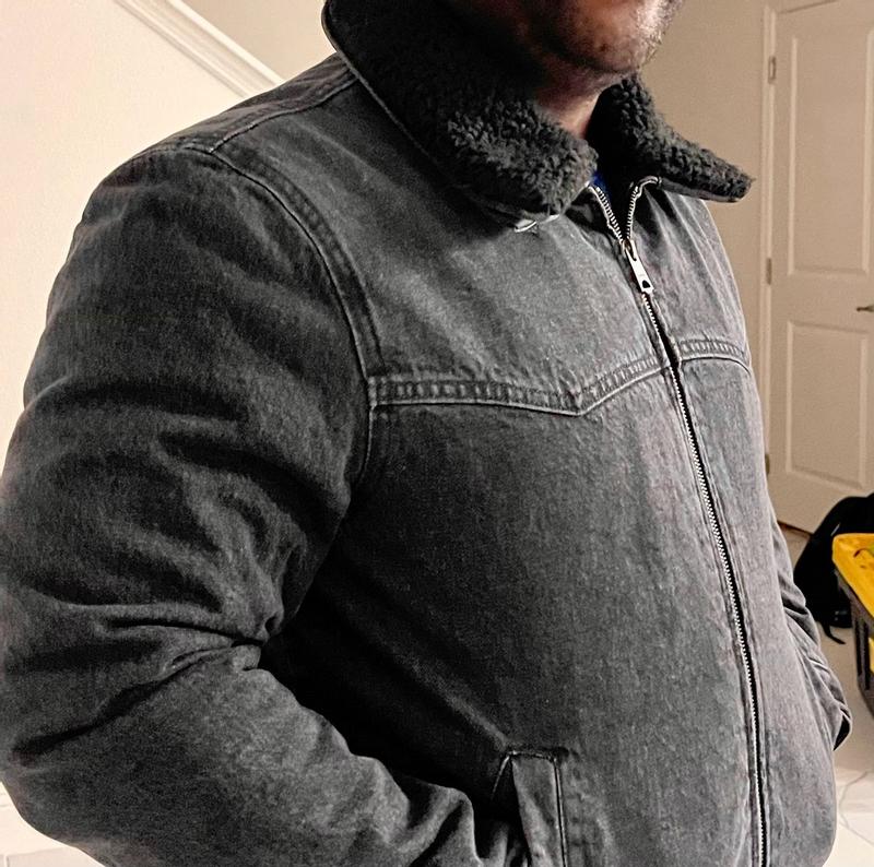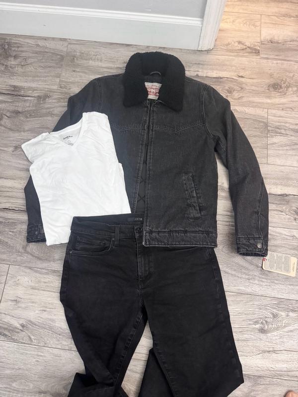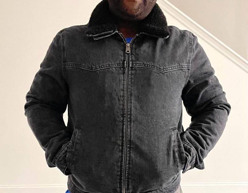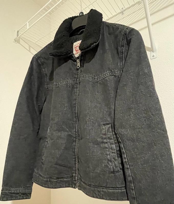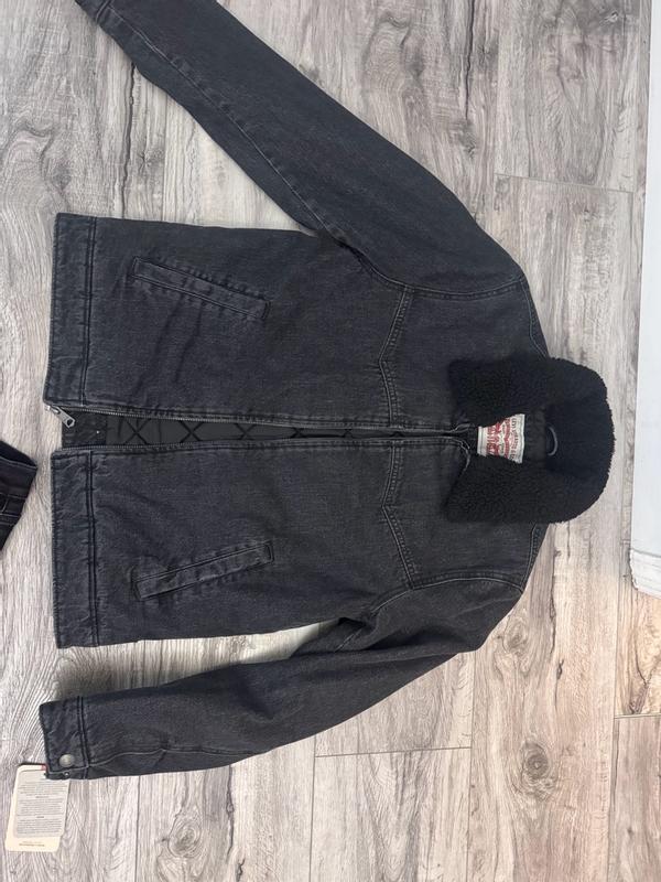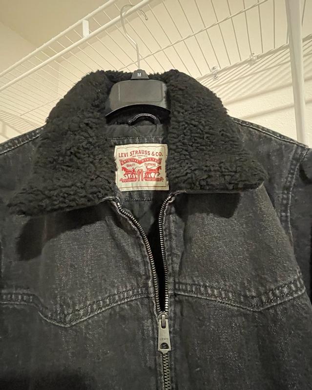 The Levi's denim Western jacket in black is very comfortable and stylish. Loved that I could take off the Sherpa collar. The sizing is good and the fit is good and it seems very durable. Just wish it was a darker black color and not faded.