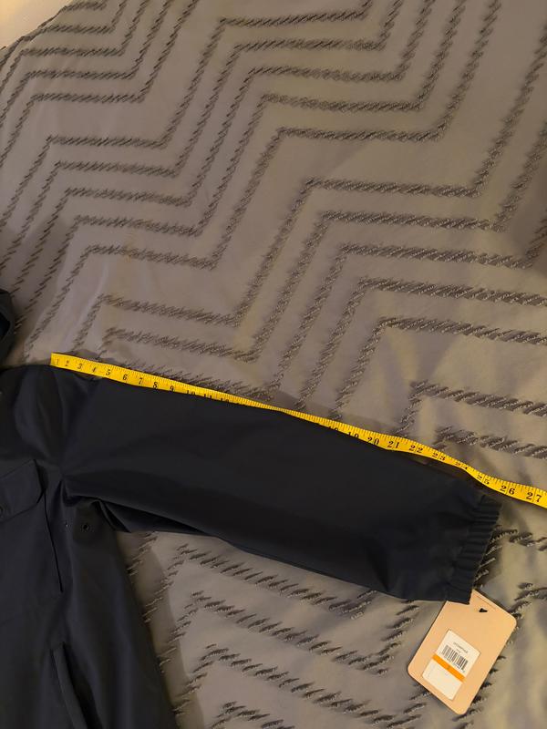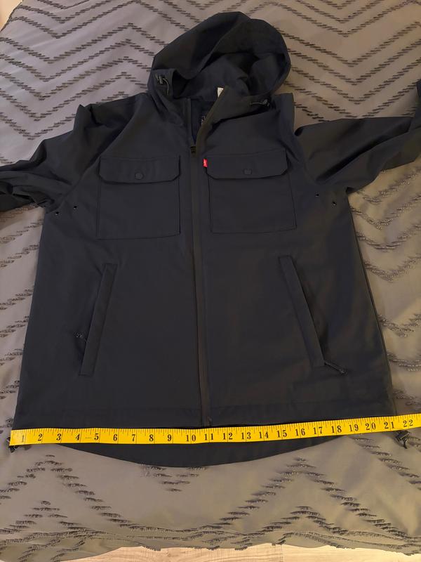 My review is for size S ( "navy" color ), i was expecting this jacket to run a little big as do most clothing these days, but i was hoping it would be a little smaller than the worst case scenario, but it arrived exactly in the worst case scenario, so im not sure if i will keep it, as i was expecting a little bit smaller, also the fabric is noisy with movement. I measured the chest's pit to pit, & measures about 22.5", which is quite large for a size S, the mid section hardly tapers, at roughly 22", and the bottom opening at the loosest adjustment is about 21.5", fortunately you can tighten this area to reduce it to less than 40", which will fit snug, but the rest of the body kind of looks awkward if you're more on the slim side. the shoulder to shoulder measured at roughly 18", sleeves measured at roughly 26". although the fit isn't the best if you're of healthy stature, if you're gonna mainly use this as a rain jacket, then it should suffice.