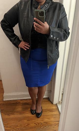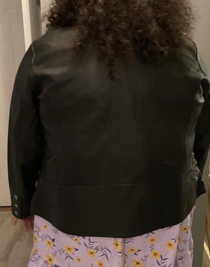 This is a very nice and soft jacket. I like the rounded collar at the top. It’s modern but classic at the same time. Goes well with jeans but also could easily go over a little black dress for a night out. It’s a little big on me in the picture just because iO ordered the wrong size. Highly recommend this jacket