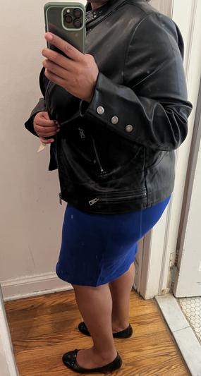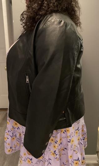 This leather jacket is soft and adorable. The fit runs a little small but not form fitting tight, it’s perfect. The length is great not too short or too long. The jacket is so versatile and can be worn dressy or casual!