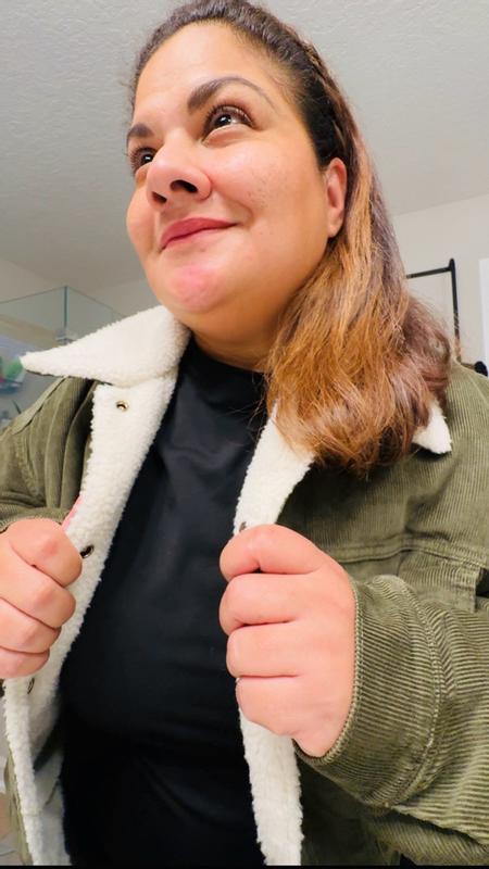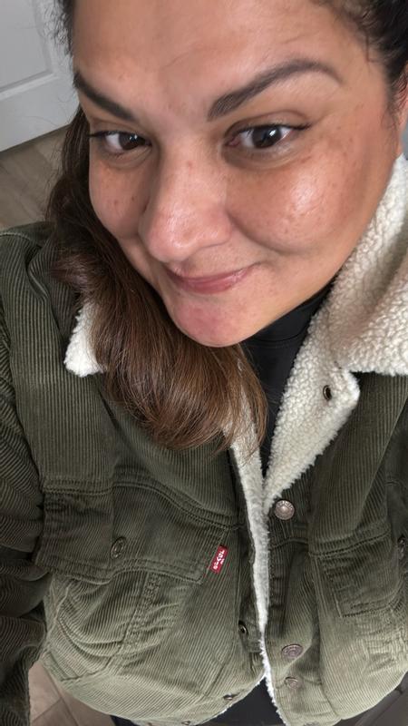 I'm usually an XL in Levis jackets but sized down one to at the recc. of other reviewers. It's still pretty oversized esp at the arms that it feels like i could size down one more but it's already narrow towards the waist and hip and the last two buttons are too tight to button. The outer corduroy is 100% cotton. The sherpa lining is 100% polyester and not as nice as a previous sherpa lined jacket I owned from a few years ago that was also Levi's. It's softer and more faux (aka cheap) looking than I expected. The sherpa is lined only around the bodice and the arms have the typical thin polyester lining so you'll want to layer if you wear it in colder weather. I expected this jacket to have more structure or stiffness to it but it's much softer and has a puffy feel to it and is medium to light weight-but looking at the description again it does say it's made w/soft corduroy so maybe that's my fault but it does look more structured on the model in photo. 3.5/5 overall.