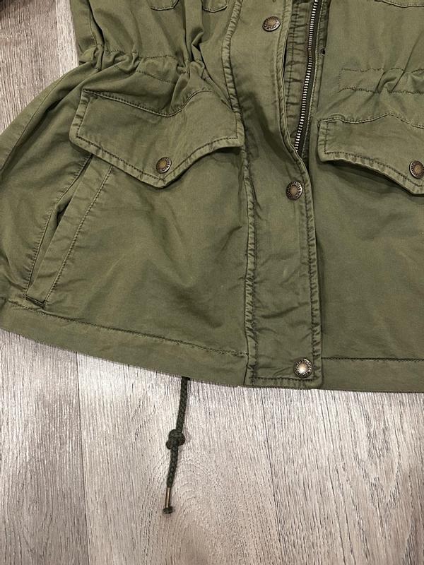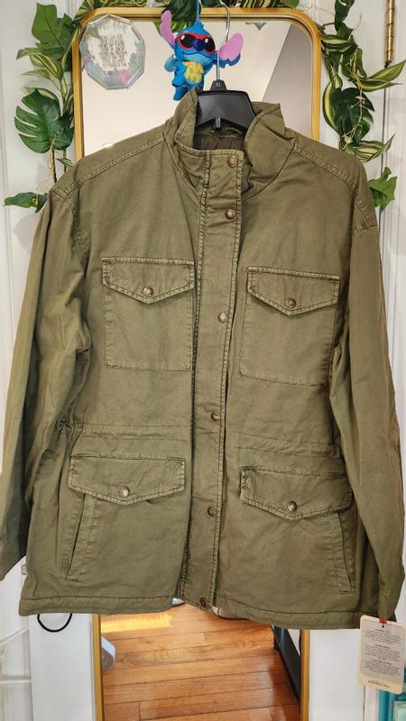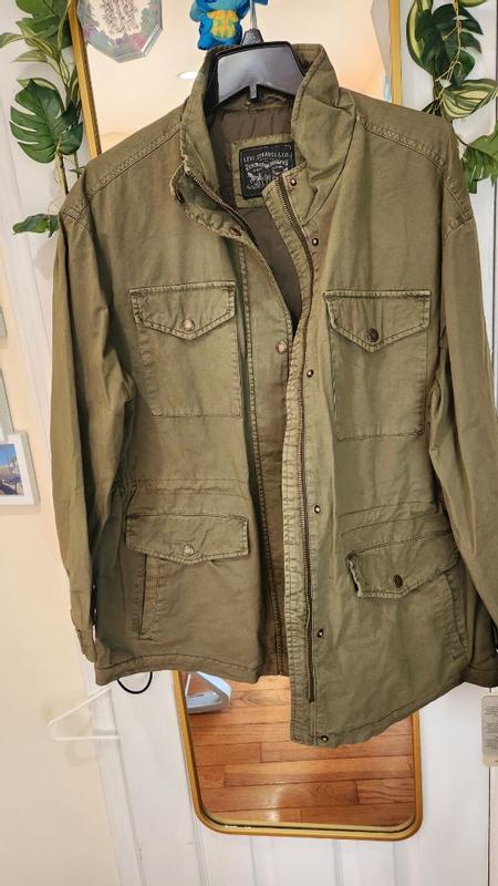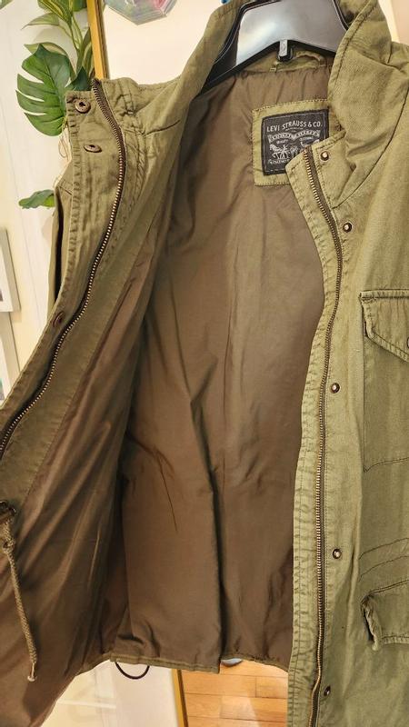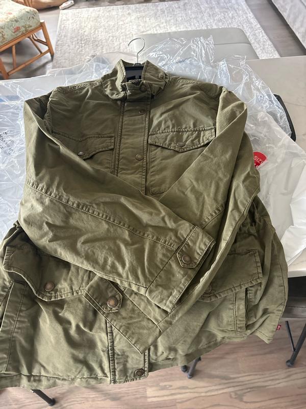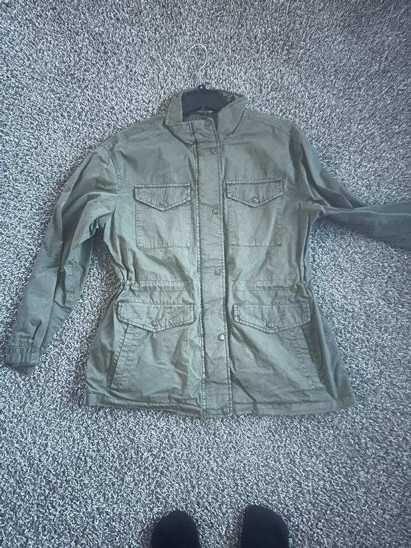 Heavy weight denim jacket. Arrived in good condition as described on the website. Zipper and snaps all in working order. Washed before wearing and hung to dry, no shrinkage. Needed a little ironing. All the pockets are useful for everything needed on a walk with the dog. Purchased a size Medium and for reference I am 5’4”, 123 pounds. The jacket fits well with the waist slightly adjusted with the toggles. The size allows room for layering. Sleeves length is perfect.