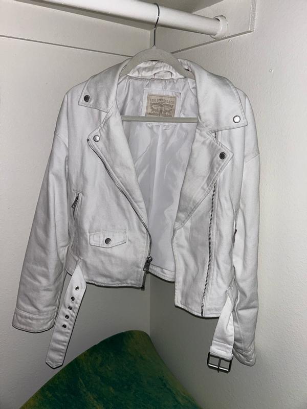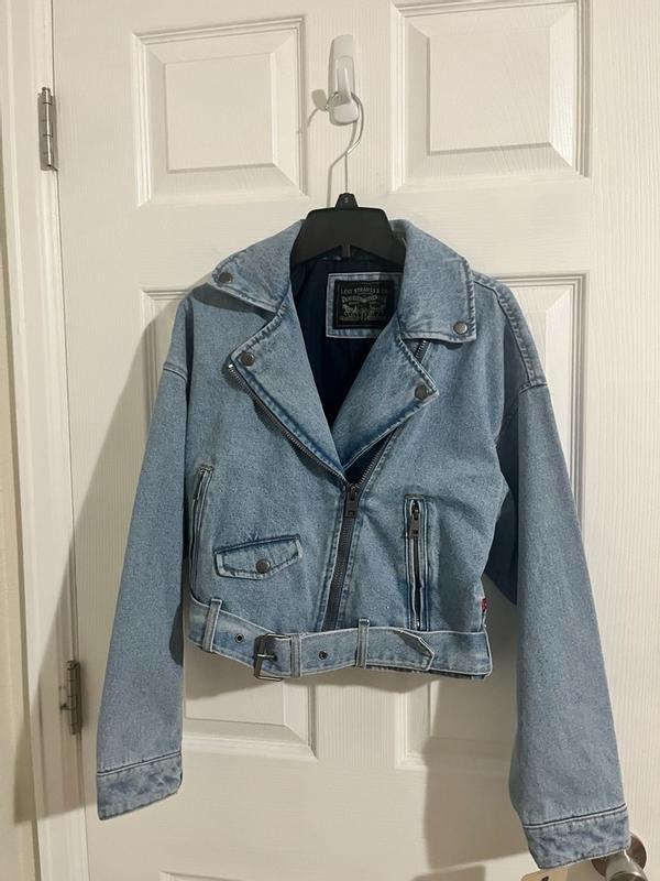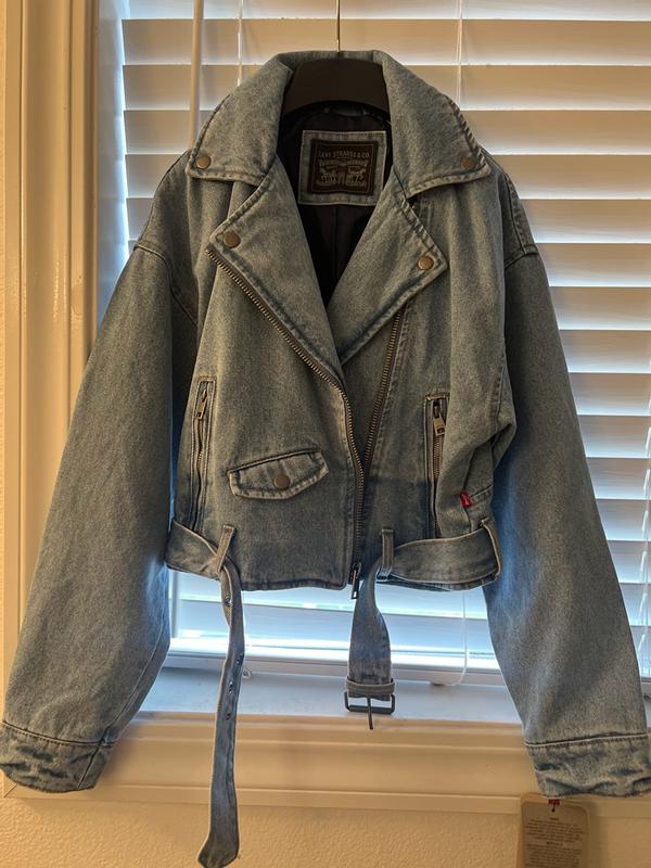 This Levi Strauss & Co. denim moto jacket is a perfect blend of rugged, classic denim and edgy biker aesthetics. With its light-wash denim and cropped, structured silhouette, it’s a standout piece that gives off a bold, retro vibe while still being effortlessly wearable.
