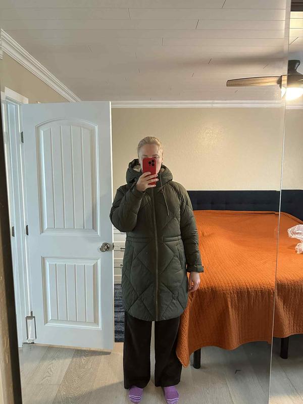 Good length and color, but very bulky. The zipper doesn’t look reliable. The right sleeve had a defect and didn’t keep the hand warm; it feels like there isn’t enough insulation. The internal waist adjustment is convenient (for pregnant woman it's a big plus). It looks better on women 60+