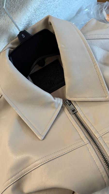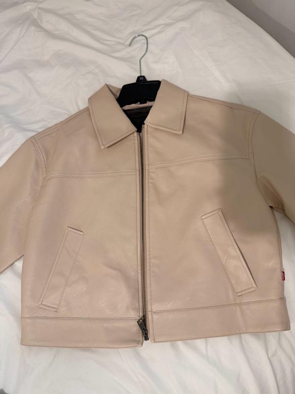 I am obsessed with this leather jacket!! First off, the quality is soo good. The leather is very nice and durable. I’m obsessed with the color. It’s a nice light beige that goes with a lot of outfits. The fit of the jacket is perfect. I got an XS. I love how it has pockets and the little levi’s logo showing.