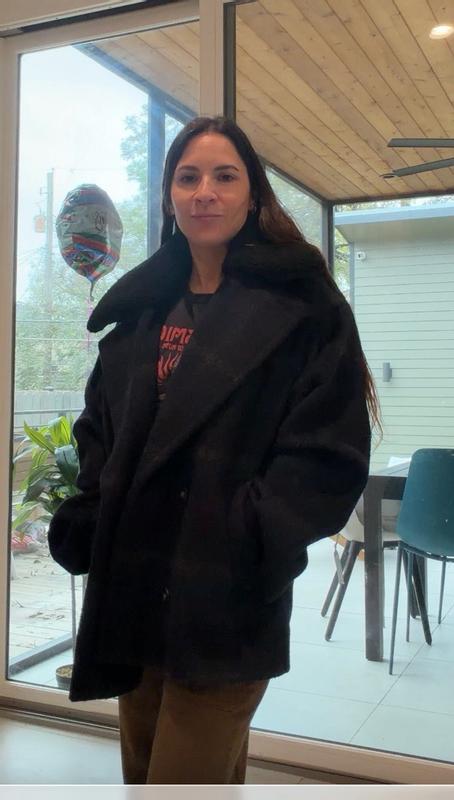 Classic pea coat with kind of a 50âs vibe. I actually really like the fake shearling collar. I was on the fence about it and planned to remove it but⊠Itâs grown on me. I like that itâs removable so that you can take it off if you donât like it. Iâve been wearing this jacket to work (I layer it over scrubs and a fleece.. I work in a hospital, so I donât want my work coat to be too precious⊠You just never know whatâs gonna happen !) and have already gotten a whole bunch of compliments on it⊠People say it looks cozy. The overall texture is fuzzyZ It is rather lightweight⊠depending on your climate more of a late fall type of coat. I live in the northeast and would not consider this to be a true âwinterâ coat. I think it runs a little bit large. I got a medium, I am 5 foot six and about a size 6. The sleeves are long on me. I also have room to layer under it. It is 100% synthetic material. Not usually my first choice in fabrics but Iâve enjoyed the coat. I was gifted this product in exchange for my honest review.