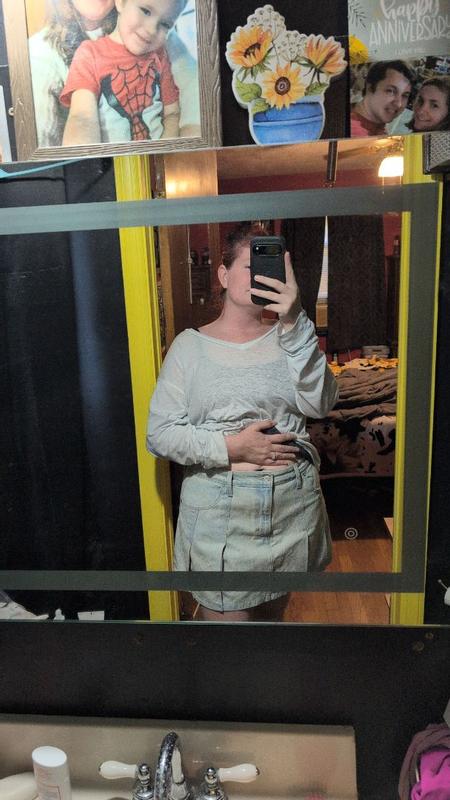 loving this fall outfit all because of this denim flare skirt that has recently become one of my go to’s for the fall pairing it with tights and booties! Certainly a brand that has become a favorite due to long lasting denim & style. Very soft Jean material, does get runched up fast and had to iron after the first wash but I’ll keep using this all fall/ winter long. I absolutely loved it. Perfect high waist , covered my lower pouch perfectly 🤭 ( I’m 4”11 & 139 lbs size 29 in this style)