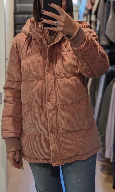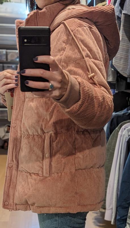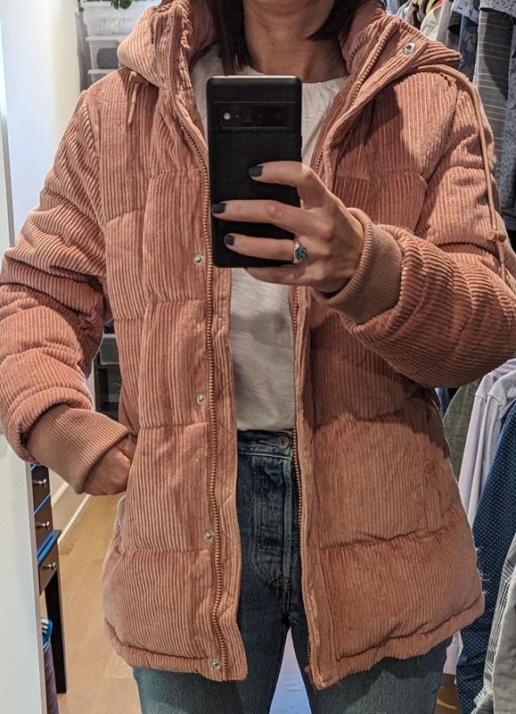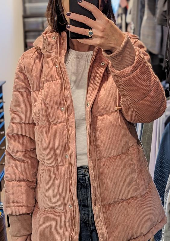 Super nice jacket... comfy, cute and warm! But the hood drooped over my face when up, so had to return. I'm very petite, so might not be a problem for others.