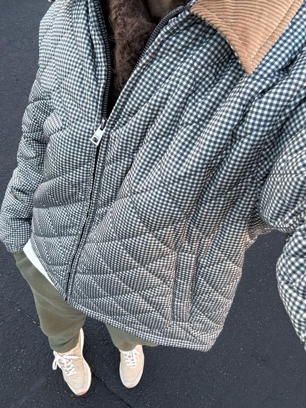 This jacket is the perfect amount of puffy, it doesn’t make me feel like a marshmallow, and it isn’t too stiff. It also keeps me pretty warm in the cold illinois winter temperatures, so I’d say it does its job! I do wish the pattern wasn’t just printed on the jacket, since it makes it look a bit cheaper, but if you don’t want an oddly textured jacket this is probably perfect for you. LOVE the corduroy addition personally!
