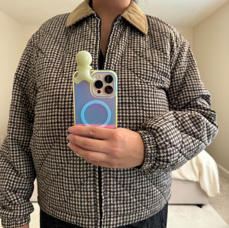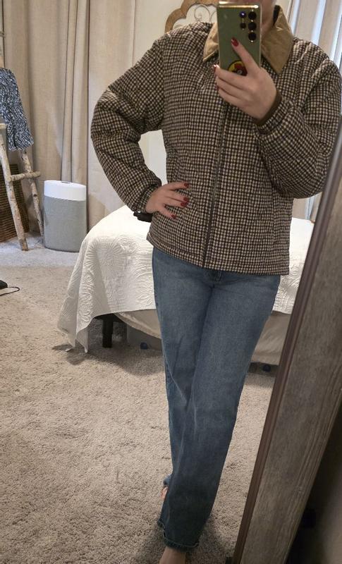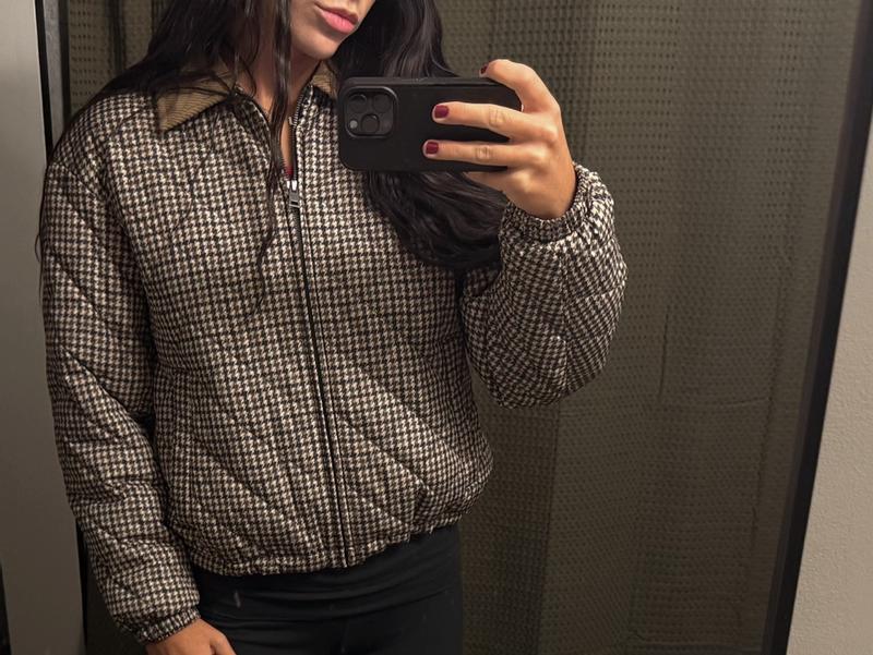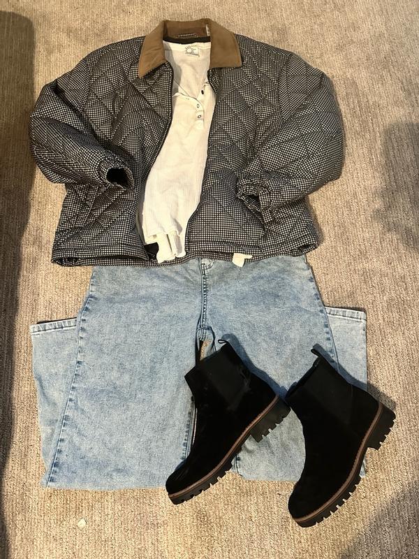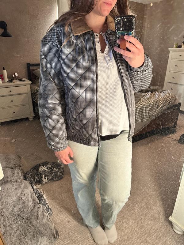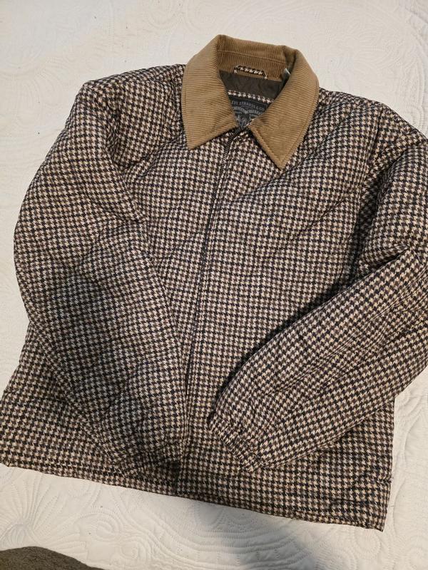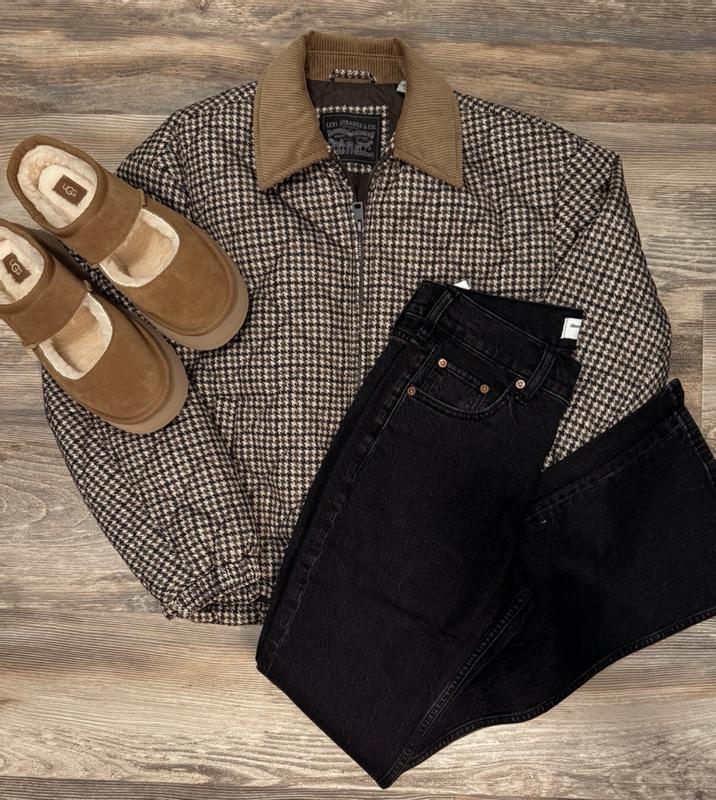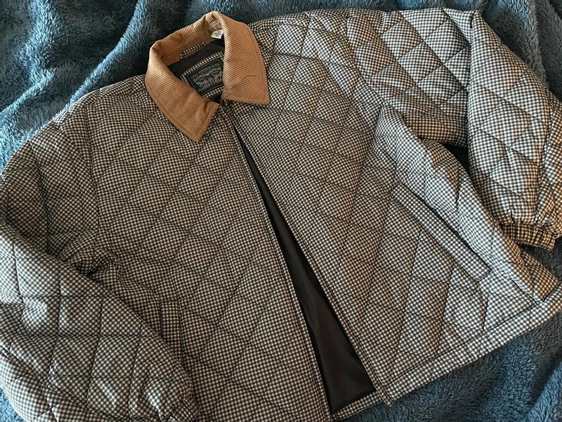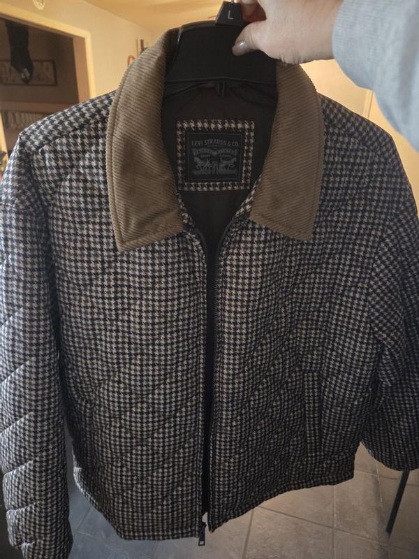 This Levis jacket is so cute! I love the houndstooth print and mix of fabric textures - the collar is corduroy and the outer lining of the coat is vinyl like material. This style in particular runs a little oversized, but still true to size depending on preferred fit. The bottom allows you to cinch in the waist for a more crop and tighter fit. I requested a size smaller than my usual and still be will able to wear a thicker top underneath. It has been warm and comfortable for the fall months in the Midwest, however, I cannot say how warm it will be when it hits winter.