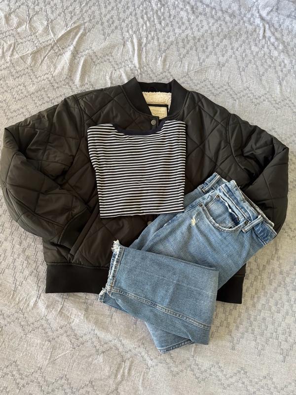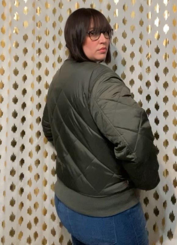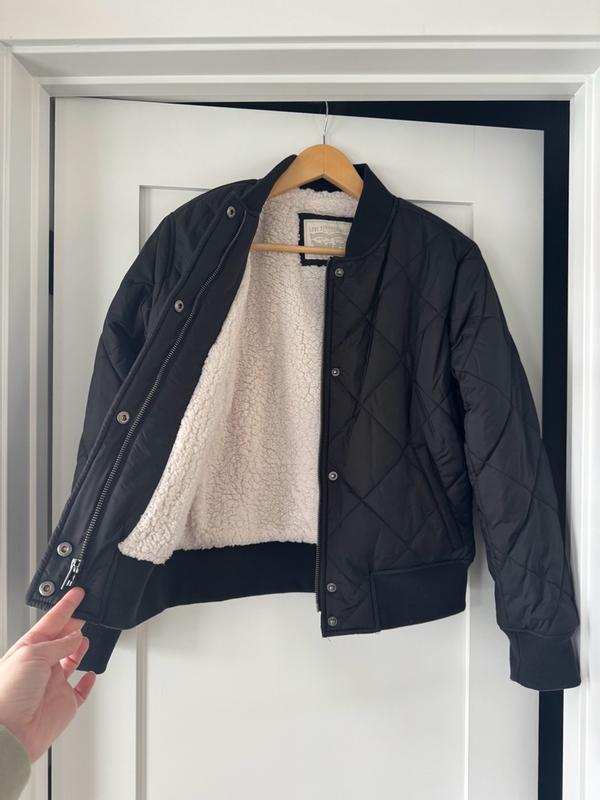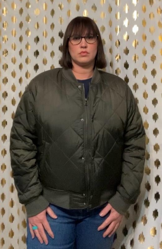 I absolutely adore this jacket! It is super flattering and beyond cozy. The outside feels silky and repels water nicely, while the Sherpa lining inside keeps you toasty warm. The bomber-style cut is great because it doesn't completely swallow you up or look too bulky. I typically wear S/M, but I got this in XS because I wanted a little more of a cropped look and I do not wear thick or oversized sweaters underneath my jackets so it wouldn't be a problem to size down. The XS fit me perfectly! I am in love!