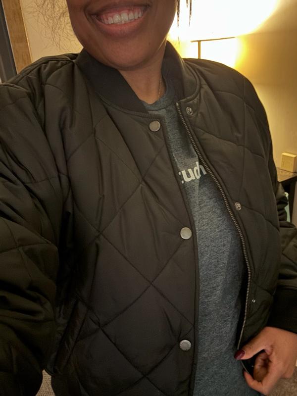 This is such a cool bomber jacket love the quilted look. This is a great jacket for spring or a cool fall night. It has a very cozy fleece lining. The cuff is sharp and color is a nice jet black! It’s quality classic Levi’s!