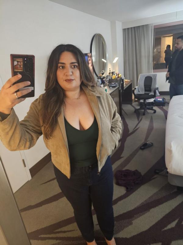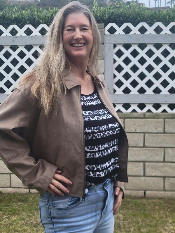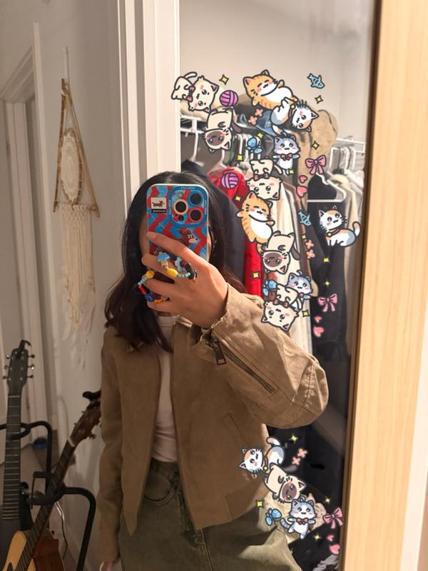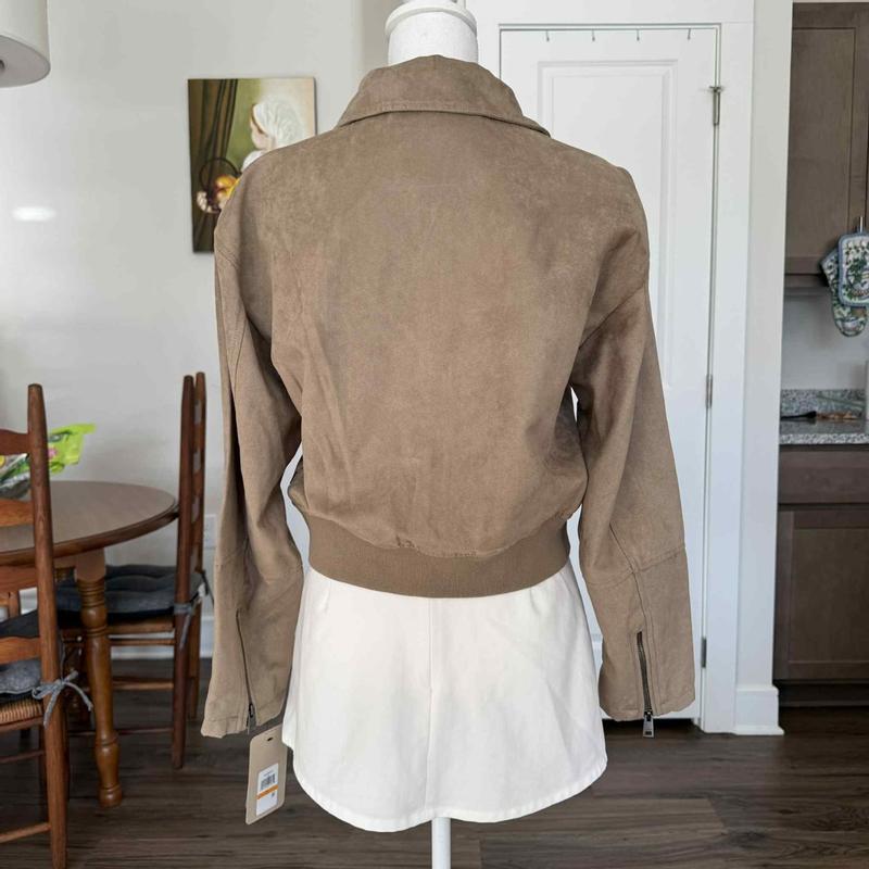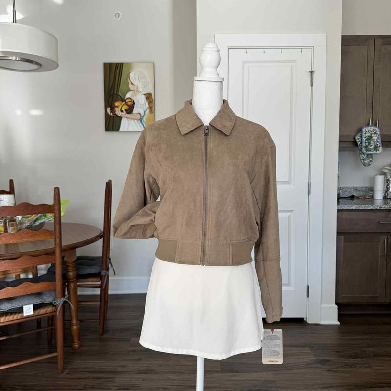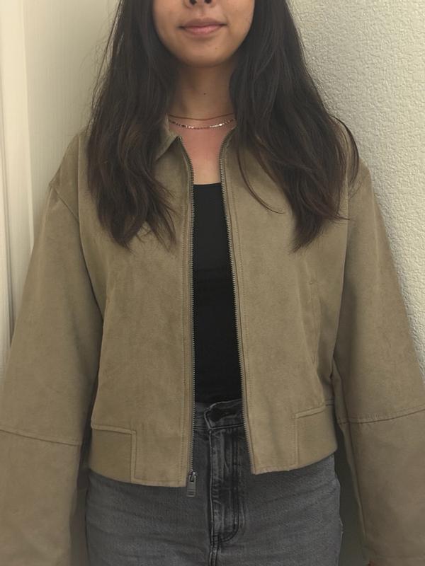 This bomber jacket is absolutely perfect! The faux suede material feels luxurious and high-quality. The fit is flattering and the laydown collar adds a stylish touch. It’s warm enough for cool days but not too heavy. Goes with everything from jeans to dresses. The tan color is versatile and the craftsmanship is excellent. Definitely a wardrobe staple!