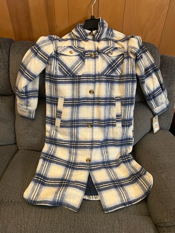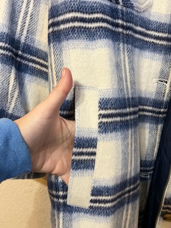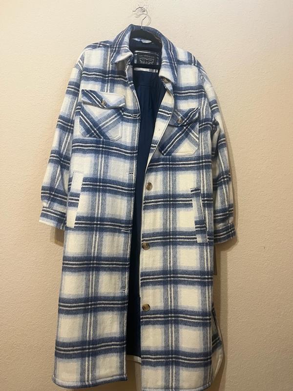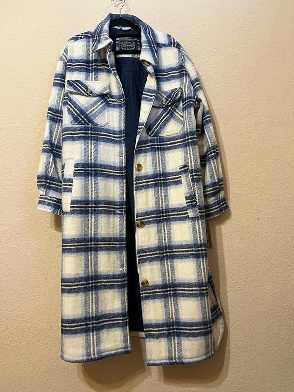 The Long Wool Blend Plaid Jacket by Levi's is very stylish. It is not too heavy but still keeps me warm on the few cold Texas winters. I the am petite so this jacket was very long on me. I am usually a size large in shirts but the size small jacket fit fine. It has a zipper for ease of closing and button closures on top of that. The wool blend on the outside of the coat is very soft and the jacket is lined nicely. It has 2 chest pockets which are nice and 2 side pockets. Do not put your phone in the side pockets. They are shallow and things fall out easily. It is also hard to sit in the jacket zipped because it goes down to my knees. The color is a pretty blue though. I feel like I'm wearing a fashionable blanket. It also washes and drys easily.