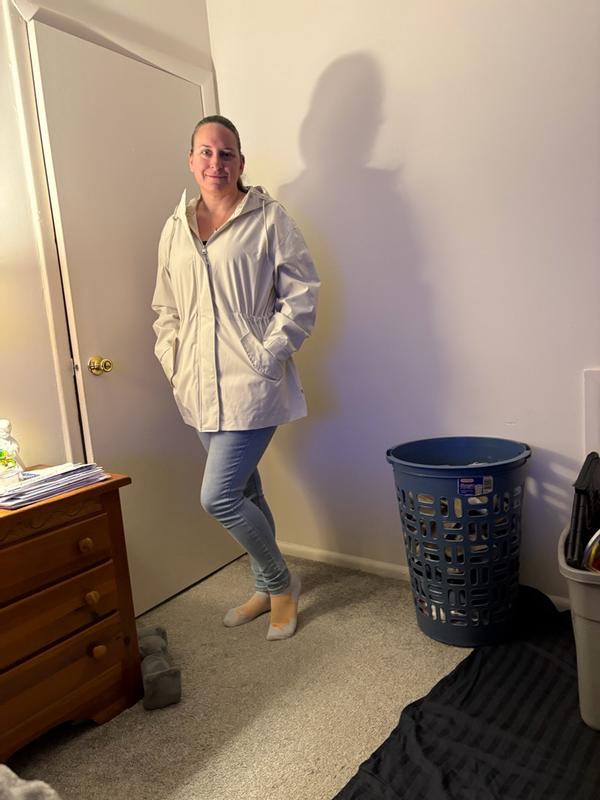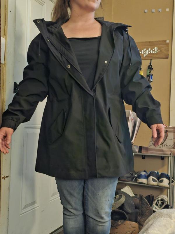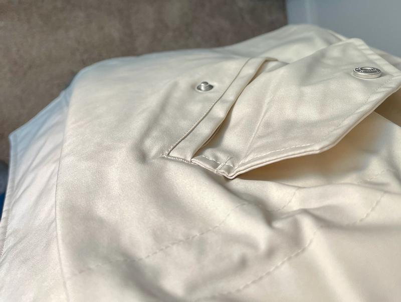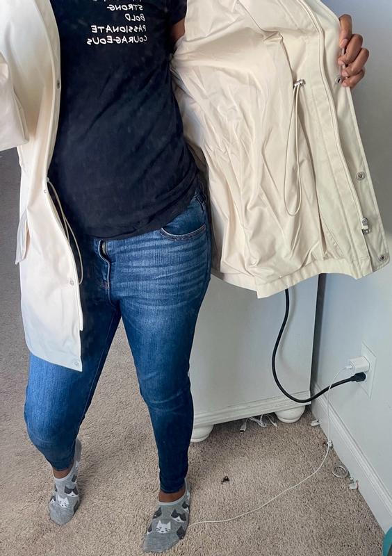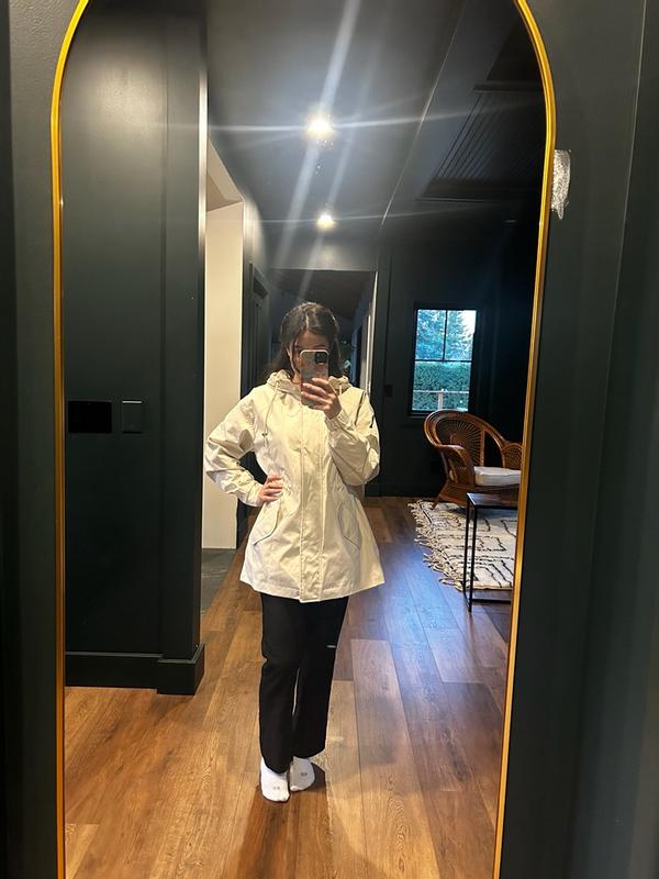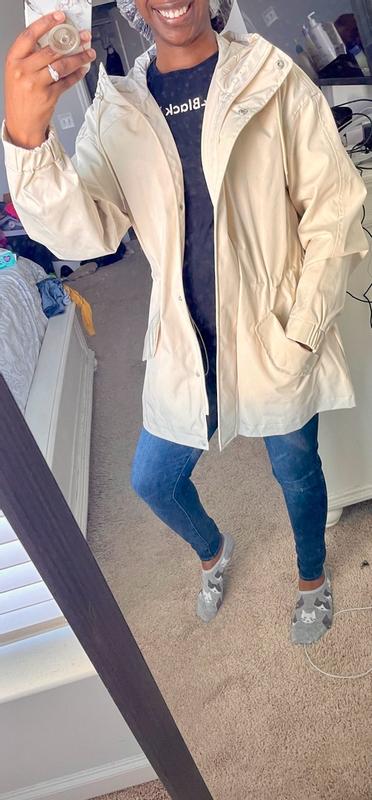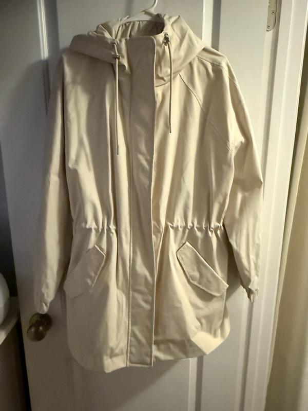 I love this Levi’s rain jacket. It is not only warm with a nice hood but repels water so well. It has a great length. The zipper is made super well. You can cinch in the waist. The buttons are great quality. I love the white/cream color. It’s breathable on days when it’s a little warmer. Overall it’s an amazing jacket. I would absolutely buy another maybe a darker color to switch it up.