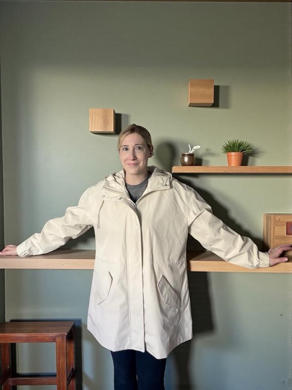 I’m 5’2” and this parka hits just below my hips and the sleeves are the perfect length. It’s flattering when you cinch the waist in a bit! It’s overall got a relaxed, cute fit, and it’s fully waterproof, which is exactly what I needed. It’s perfect for rainy weather without being too heavy or warm, especially in milder climates. Such a great everyday rain jacket!