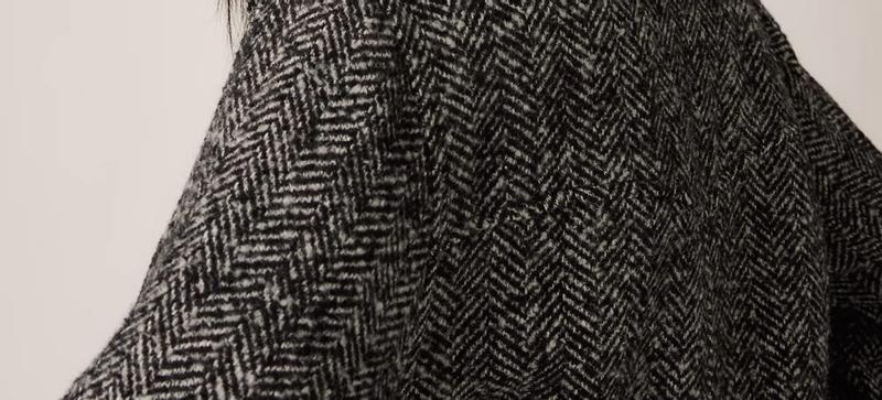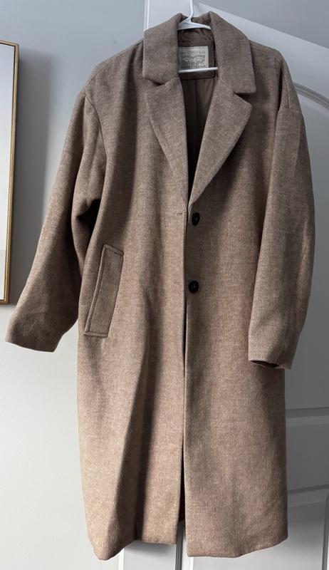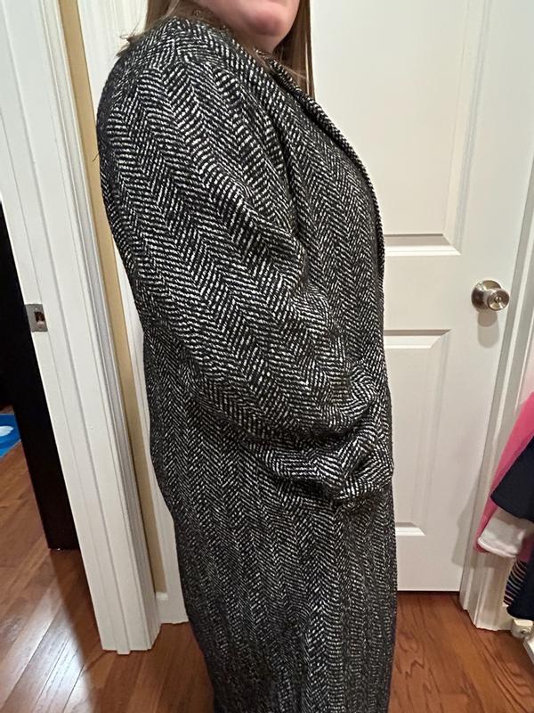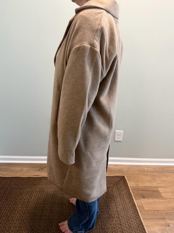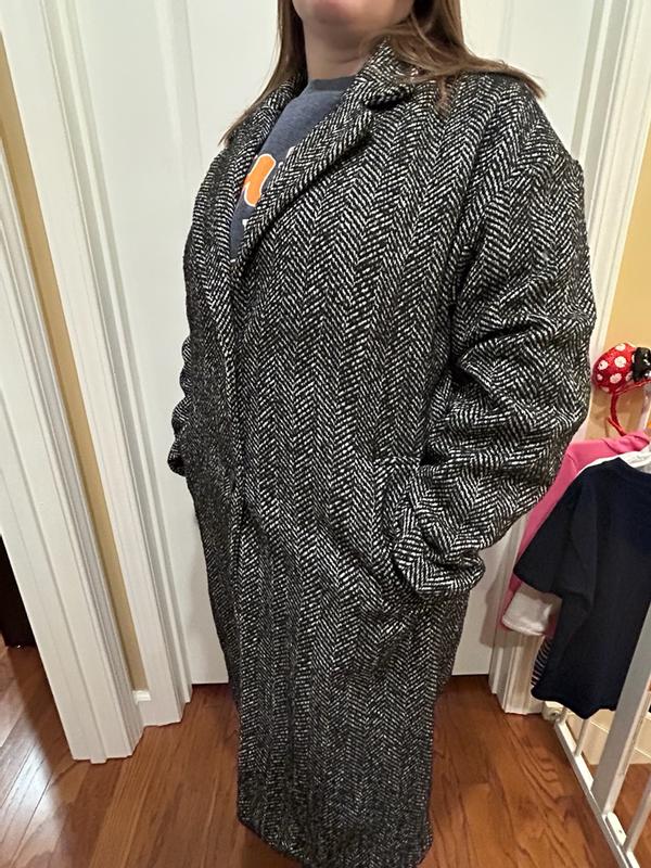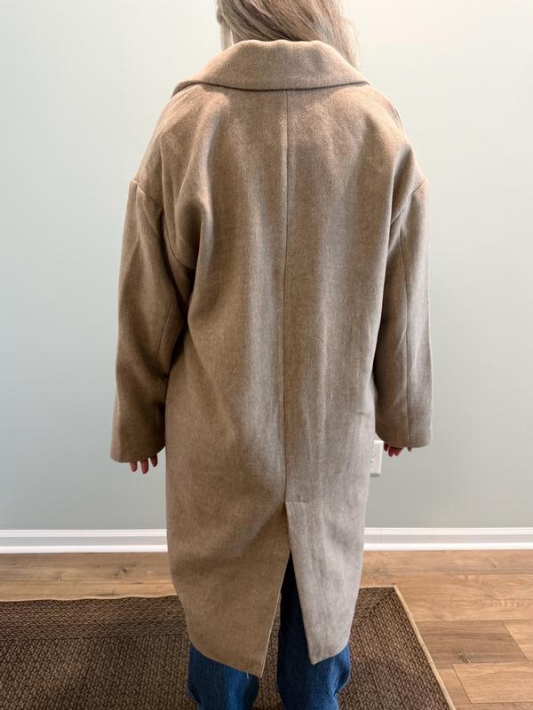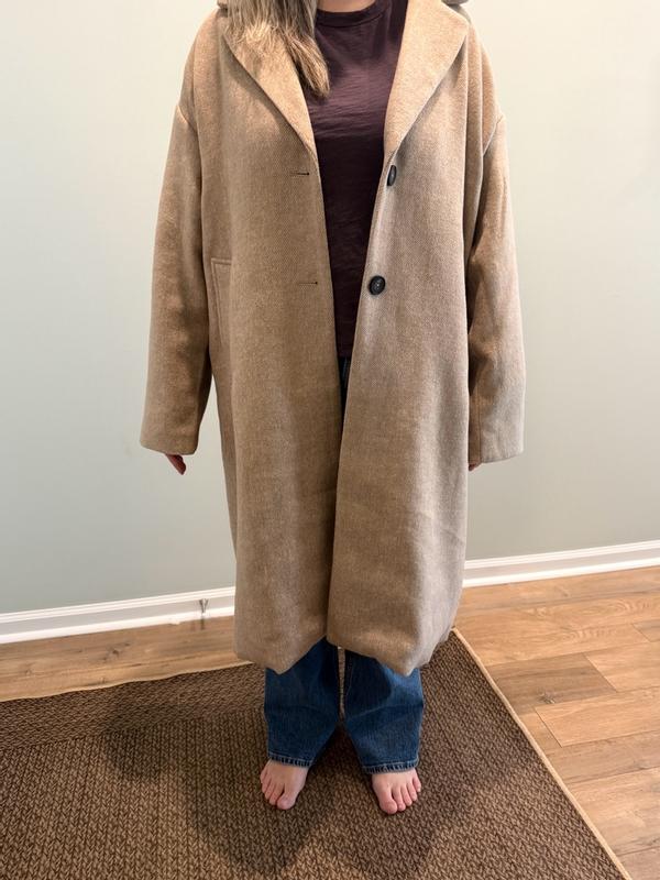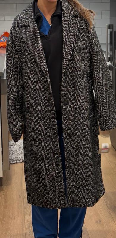 This is a very classic yet trendy coat. Very nice herringbone pattern and material. It has a nice textural look. The fit is oversized so size and style accordingly. I like layering it to complement the oversized look. It’s nicely lined and feels like a good quality top coat.