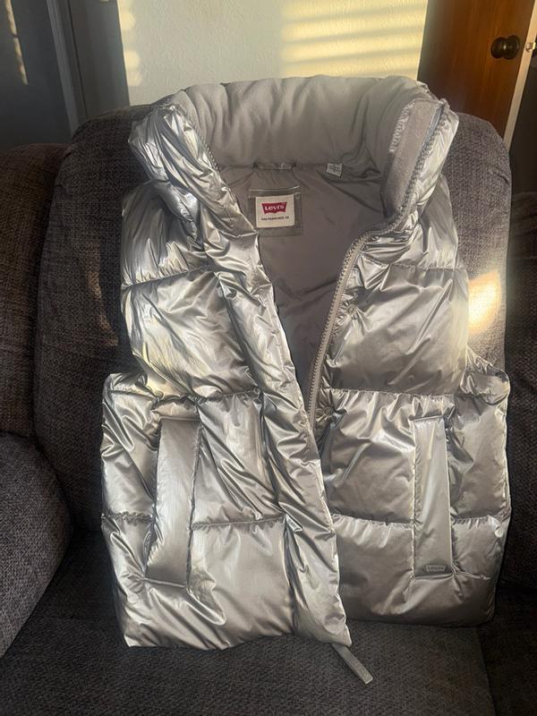 I absolutely love the Levi’s Stand Collar Puffer Vest in Metallic Silver. The fit is flattering without feeling bulky, and the stand collar adds both warmth and a polished, modern look. The metallic silver finish is eye-catching but still versatile—it elevates even the simplest outfit and feels on trend without being over the top. The vest is lightweight yet surprisingly warm, making it perfect for layering during cooler weather. The quality is what you’d expect from Levi’s: well-constructed, comfortable, and durable. I also appreciate the functional details, like the secure pockets and smooth zipper, which make it practical for everyday wear. On a cold day this vest brings the warmth, with the fleece lining. Overall, this vest strikes the perfect balance between style and function. If you’re looking for a statement outerwear piece that’s cozy, chic, and easy to wear, this Levi’s puffer vest is a fantastic choice. Size up for more room in the chest area.