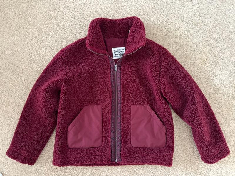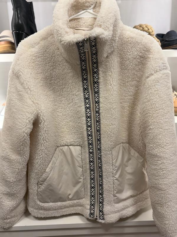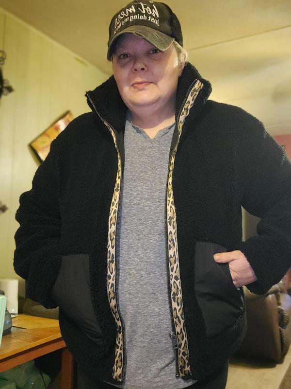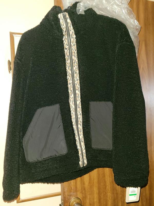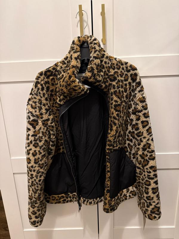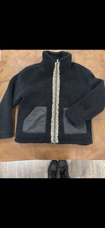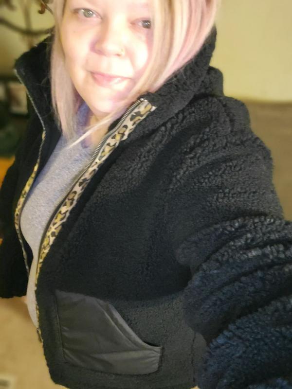 I'm loving the Levi's Stand Collar Sherpa Teddy Jacket. It's really cute, with it's leopard print lined zipper on black. It's lightweight but also keeps you warm. It's very soft Sherpa material, not rough and scratchy at all. It has an inside lining throughout, so the sherpa material isn't directly on your skin. The stand up collar is fashionable and it blocks the wind. It's made very well, as I'd expect from Levi's.