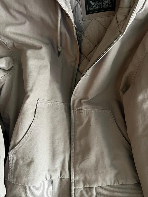 Another great jacket by Levi’s! This durable Jean jacket has a silky soft lining which is sure to keep you warm. There is an interior pocket as well as two larger outside pockets. The hood is deep enough to fully cover your head when fully zipped. 10/10