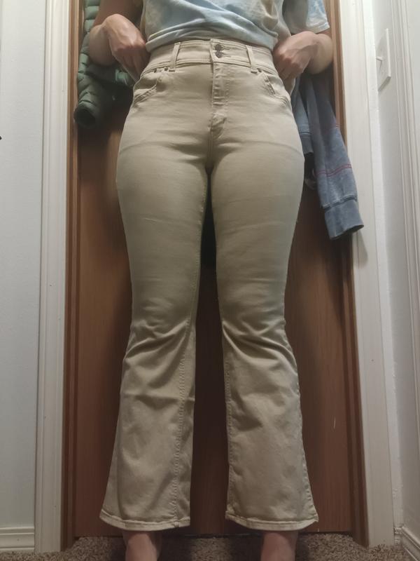 I really like the fit of these jeans, I would say true to size purchased a 25. I also like the color.