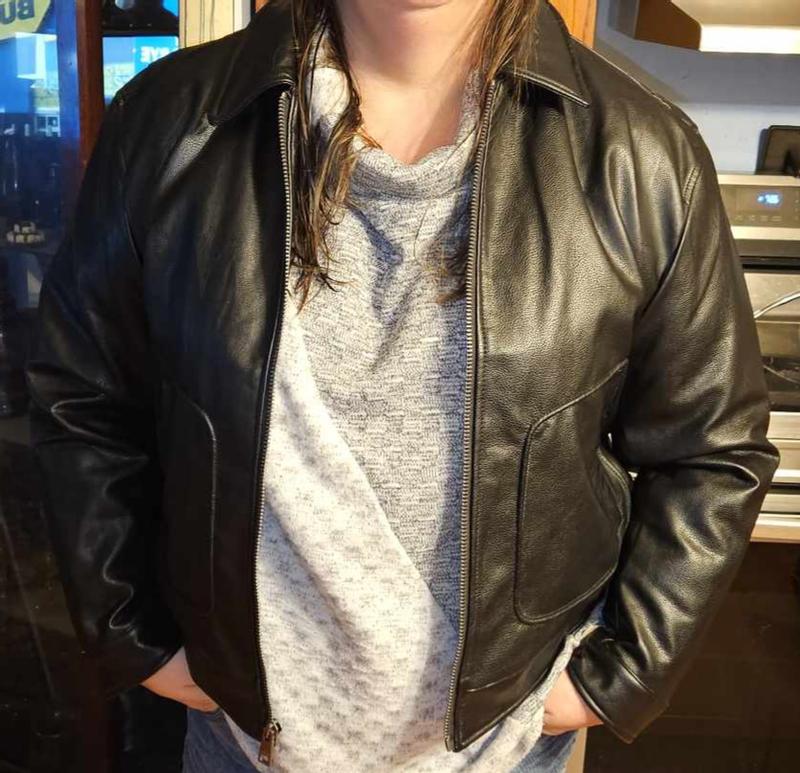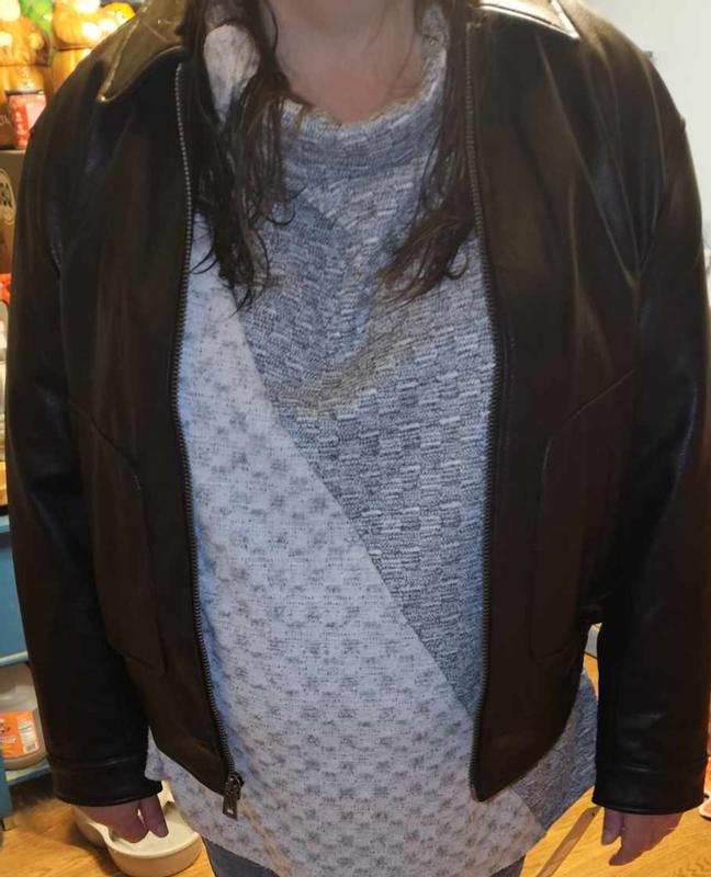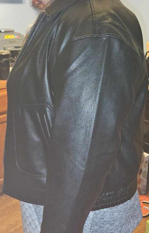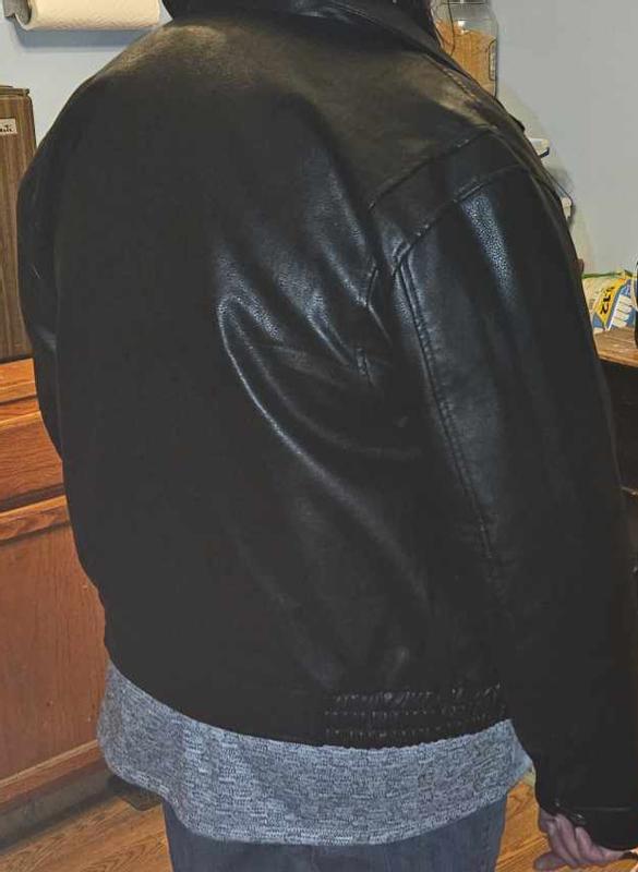 Very nice lightweight jacket. Looks good on and feels very comfortable. The faux-leather is soft and feels like real leather. Not a jacket for real cold weather but works well for mild temperatures.. Size I ordered fits nicely and length is just right.