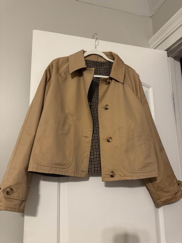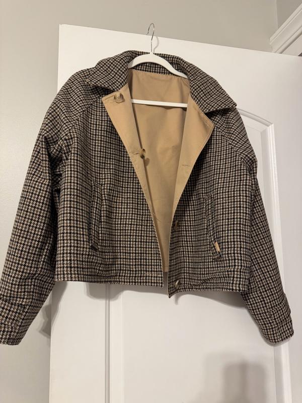 This jacket’s design is versatile and stylish thanks to the reversible feature, one side is a classic tan cotton while the other has a houndstooth pattern that elevates any outfit. The material feels durable and substantial, and the stitching and buttons are secure. It’s comfortable to wear for both casual and slightly dressier occasions, and I love that I effectively get two looks in one piece. The pockets are functional and the fit hits at a nice cropped length without feeling restrictive.
