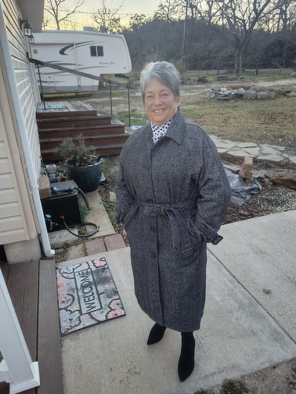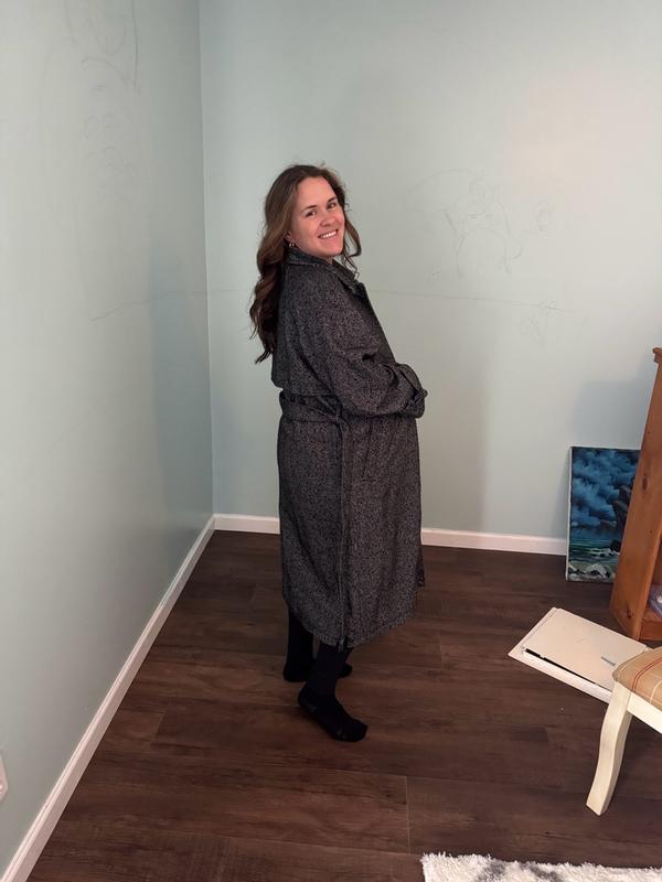 This coat is spectacularly beautiful. It has a classic, timeless look, and because it's a belted, robe-style garment, it will fit well layered over most clothes, regardless of bulk. The venting detail in the back gives a trench vibe, and the belting at the sleeves lets you adjust how tight it fits at the wrist. My mother borrowed it for a work outing, and it's just precious on her. I haven't had it for long, but it seems really well made with sturdy seams. I anticipate I'll be wearing this for years to come!