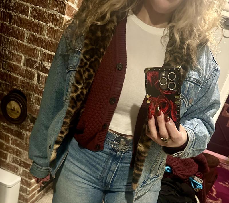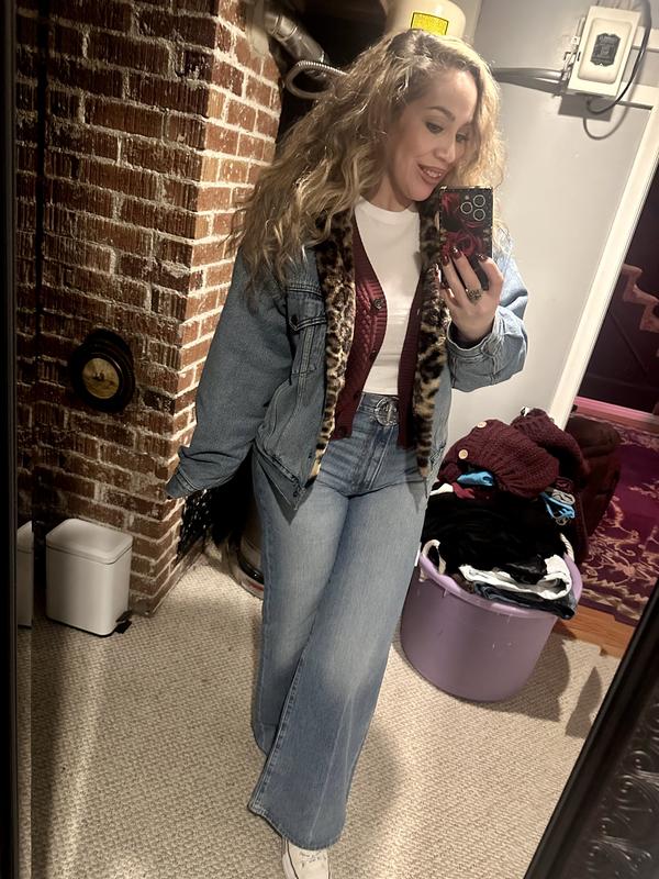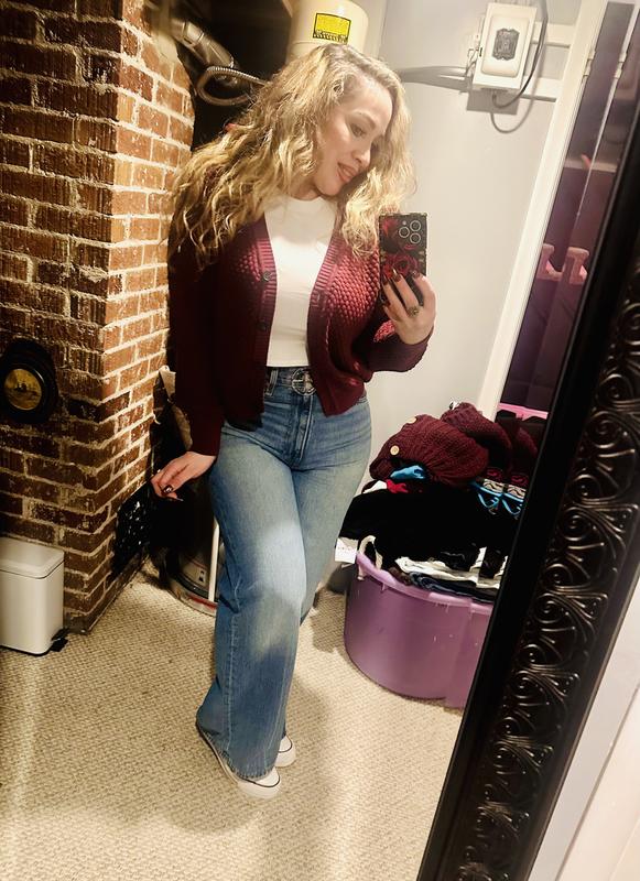 Love the color, it’s close to a Wine/ Burgundy/Brown. It’s a nice thicker cotton and i really like the semi cropped length. I would say it runs a on larger side.im 5’6” 175 I ordered a Large but I put in dryer for a bit to shrink it down. I wore it layered with the 90’s faux-fur trucker jacket and the Levi’s wide leg, high waist jeans.