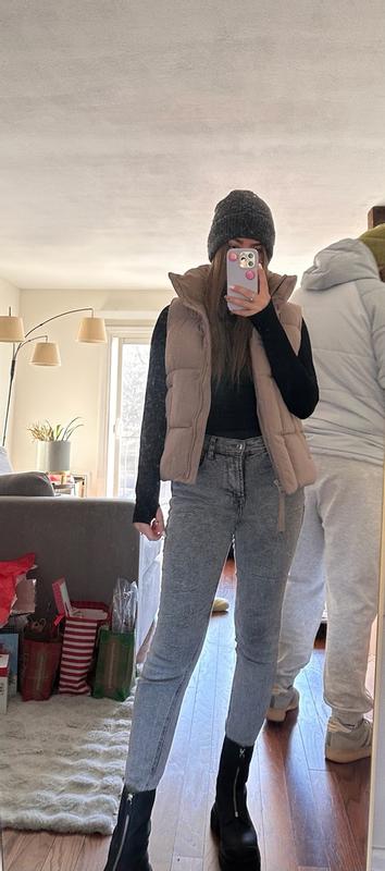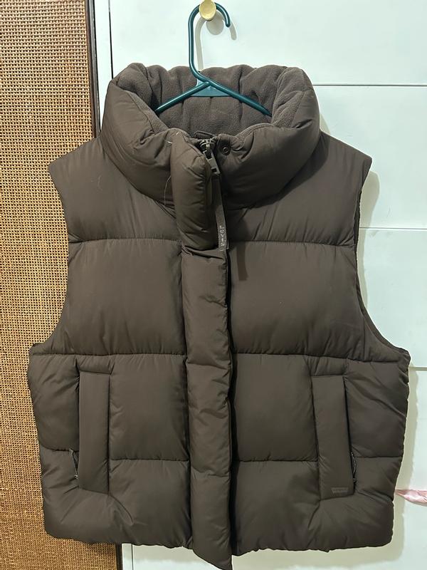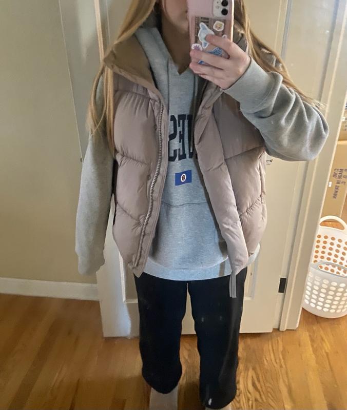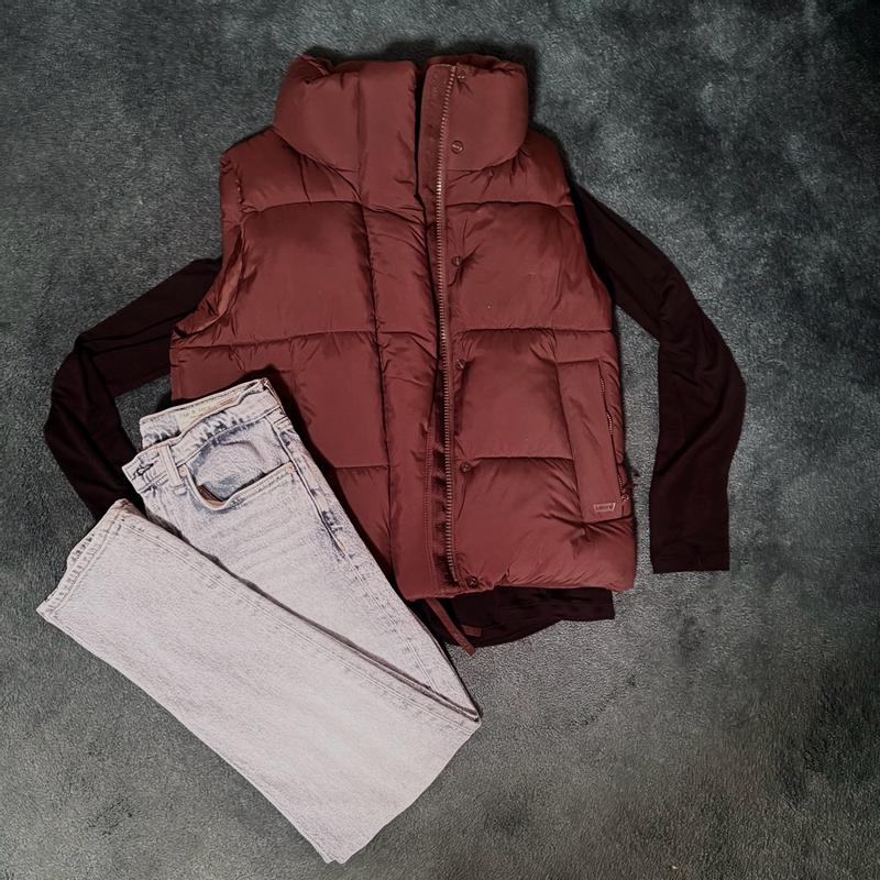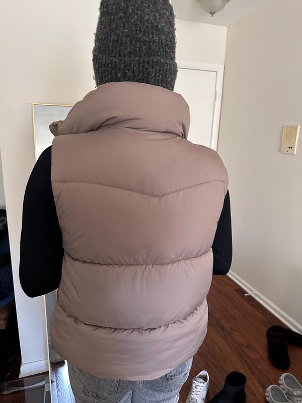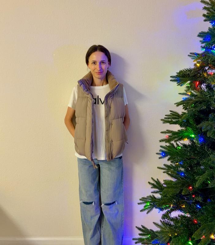 Loving this puffer vest. Its the perfect fit, i love the neck it is stylish and also it is perfect to keep the warmth on. The puffer vest is very lightweight, I love to style it with jeans and a sweatshirt underneath for a casual day and the brown color is perfect!!