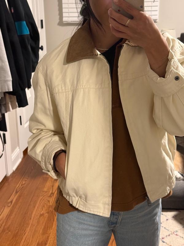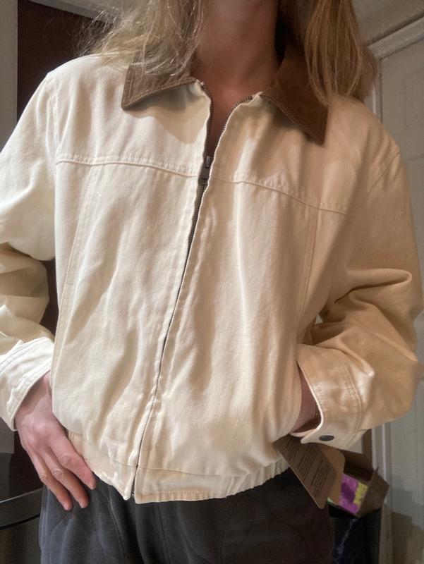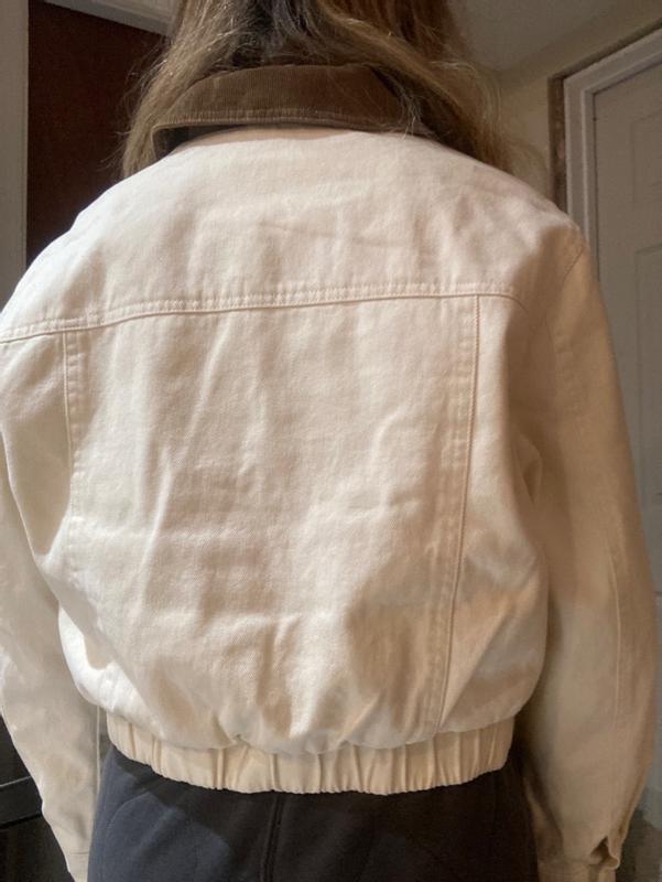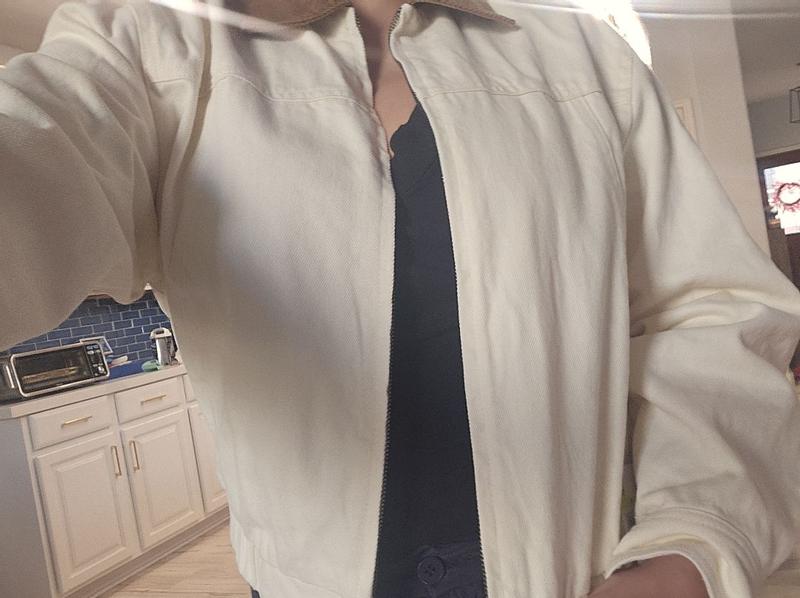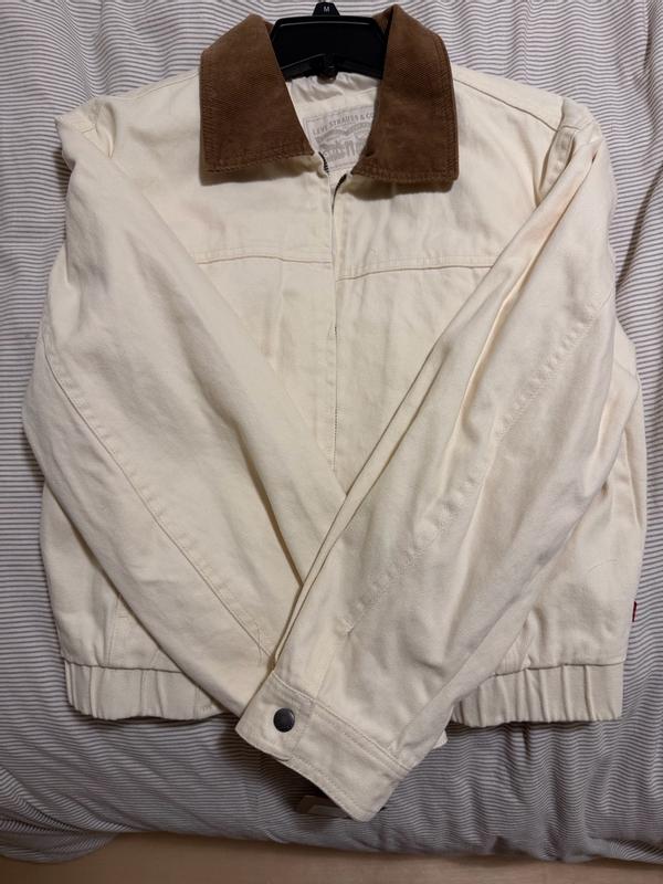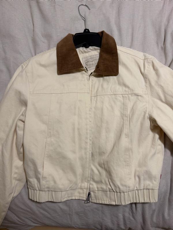 I like this cotton bomber from Levi’s! It fits me perfectly and feels very comfortable. I can wear it with dresses, or jeans or pants. The sleeves are good length.