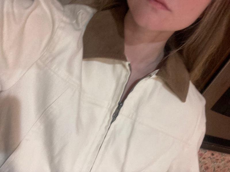 Super cute coat! I love the ivory color and the soft lining. The weight is perfect for springtime. I got my normal size and it fits perfectly. The collar is cute in the contrasting fabric.