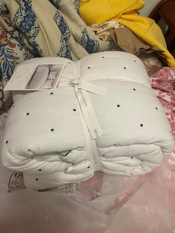 Very disappointed that the item is not as described. The navy side of the comforter has navy dots which makes it quite boring. Description says white dots. I had hoped the picture was misleading but the description is misleading. Will keep as I like the weight.