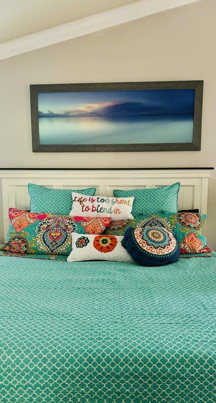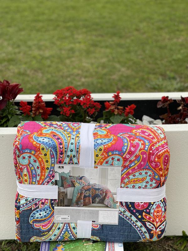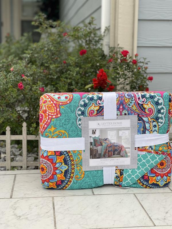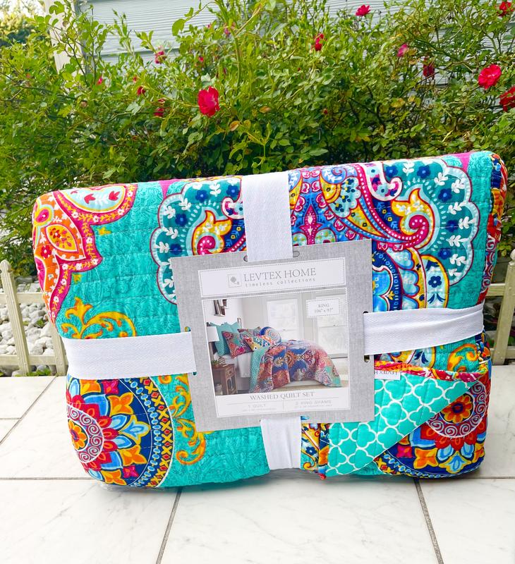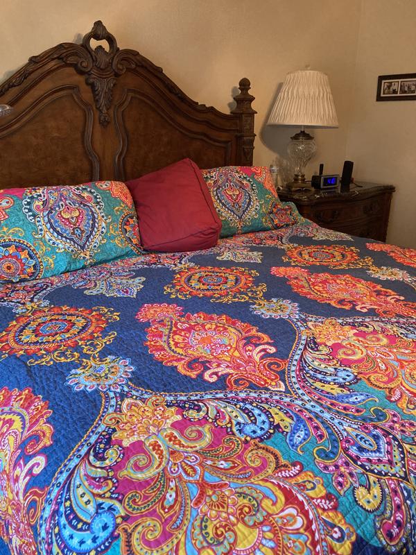 Vibrant bright quilt. Just what I was looking for. Well made. Fits my King size bed well. Matching shams complete the look. The only negative thing I have to say that is when I removed them from the Packaging and they were packaged extremely well, I flicked the cover to place on the bed and tons of dust went into the air. Not a deal breaker. No noxious smells or odors. No allergic reaction. Just not expecting it.