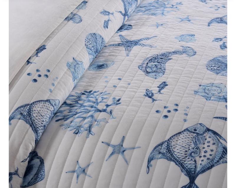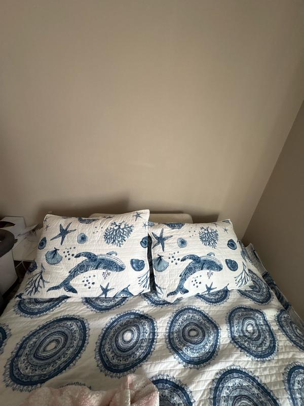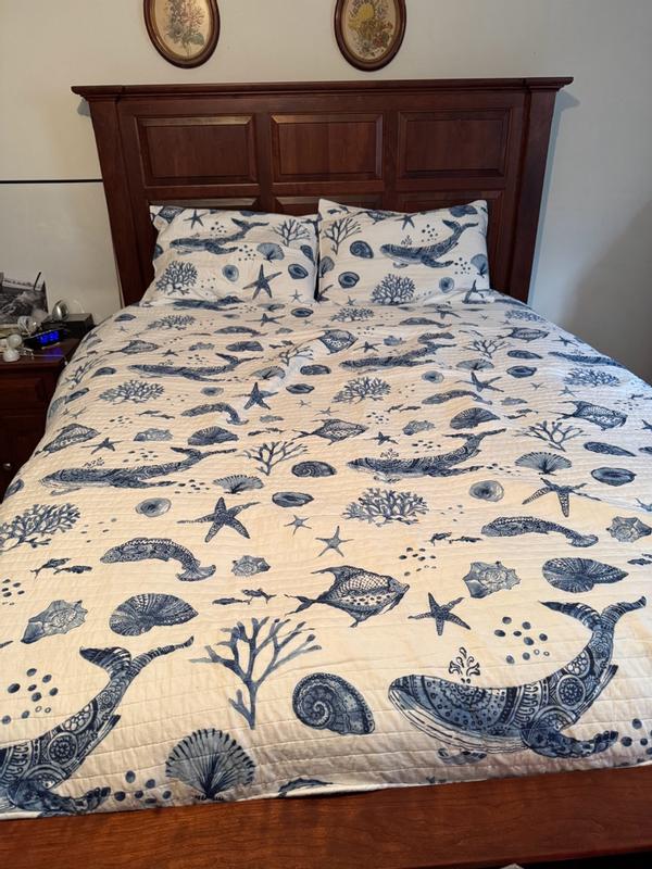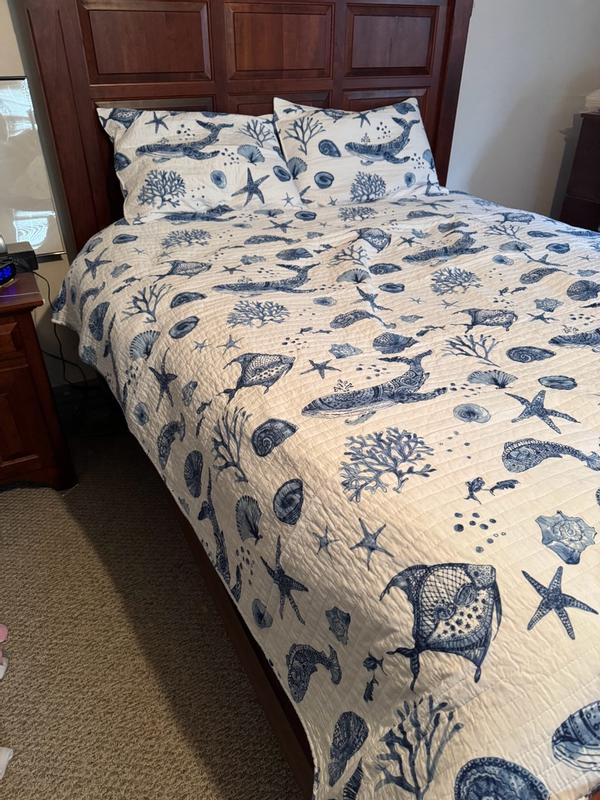 Design & Style: This set features a beautiful coastal theme with blue sea turtles, shells, starfish, and coral on a crisp white background. The blue-and-white color palette feels calm, clean, and beachy—perfect for a coastal, nautical, or summer-inspired bedroom. The pattern is detailed and elegant without being too busy. Fabric & Feel: The fabric appears to be lightweight and soft, with a quilted texture that adds a cozy feel while still being breathable. It’s comfortable for year-round use, especially ideal for warmer climates or spring/summer seasons. Quality: Stitching looks neat and evenly spaced, giving it a durable, well-made appearance. The material seems easy to maintain and suitable for regular use. The branded ties suggest attention to presentation and quality. Comfort: Provides light-to-medium warmth—great if you prefer a comforter that isn’t too heavy. It layers well with blankets for cooler nights.